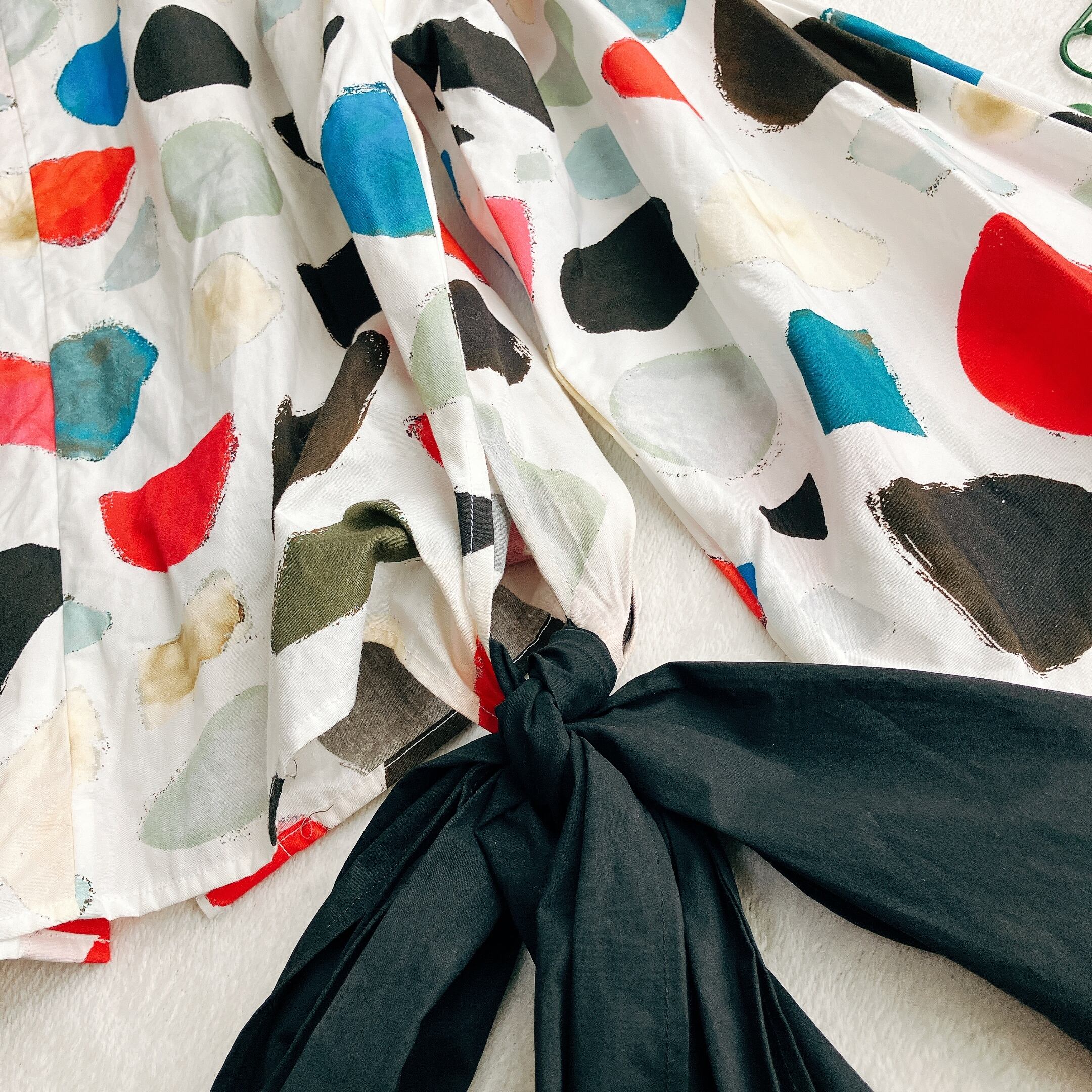 MSGM エムエスジーエム★総柄 アート柄 フレアスリーブ ビッグシルエット シャツ リボン 比翼ボタン 長袖 マルチカラー