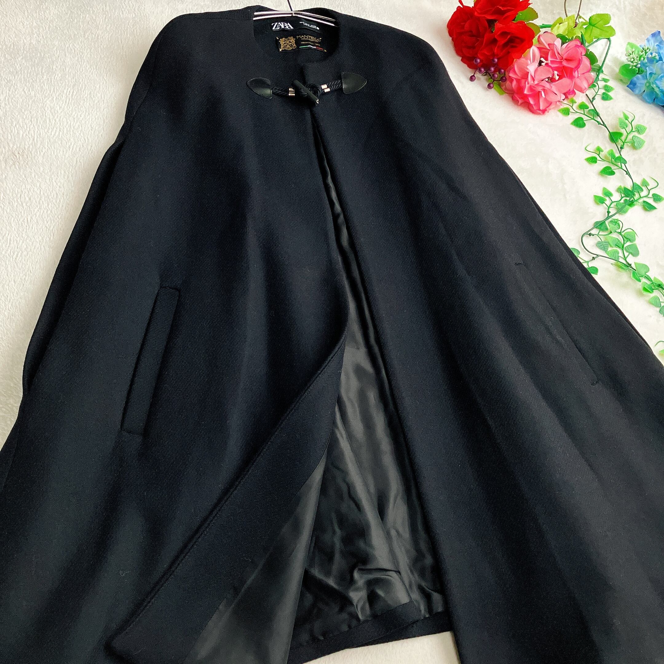 ZARA×MANTECO ザラ×マンテコ★ケープコート イタリア生地 ウール Aライン ポンチョ トグルボタン ブラック