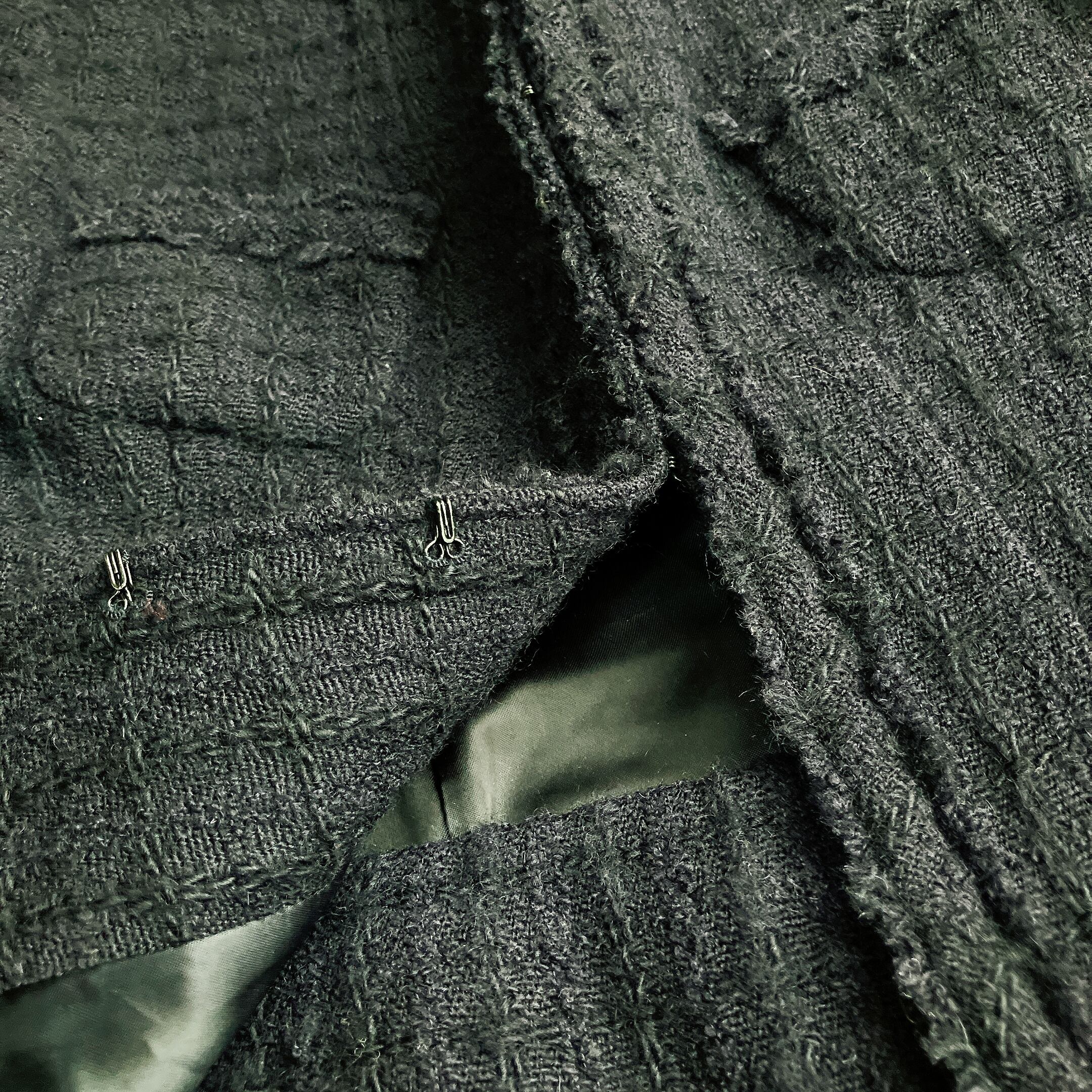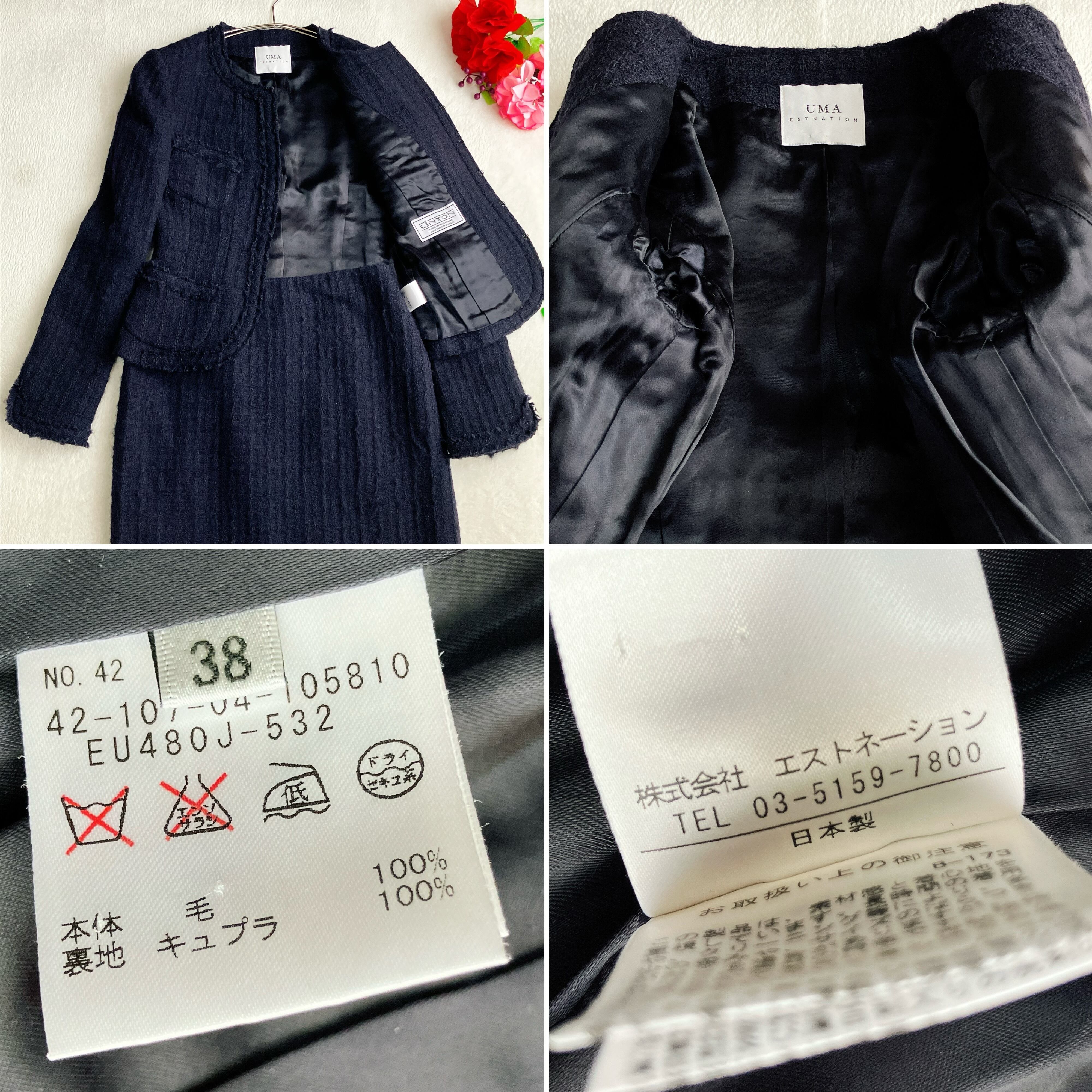 【美品】UMA ESTNATION ユマエストネーション★LINTON英国製生地 ツイード ノーカラー スカートスーツ フリンジ スリット セレモニー 濃紺
