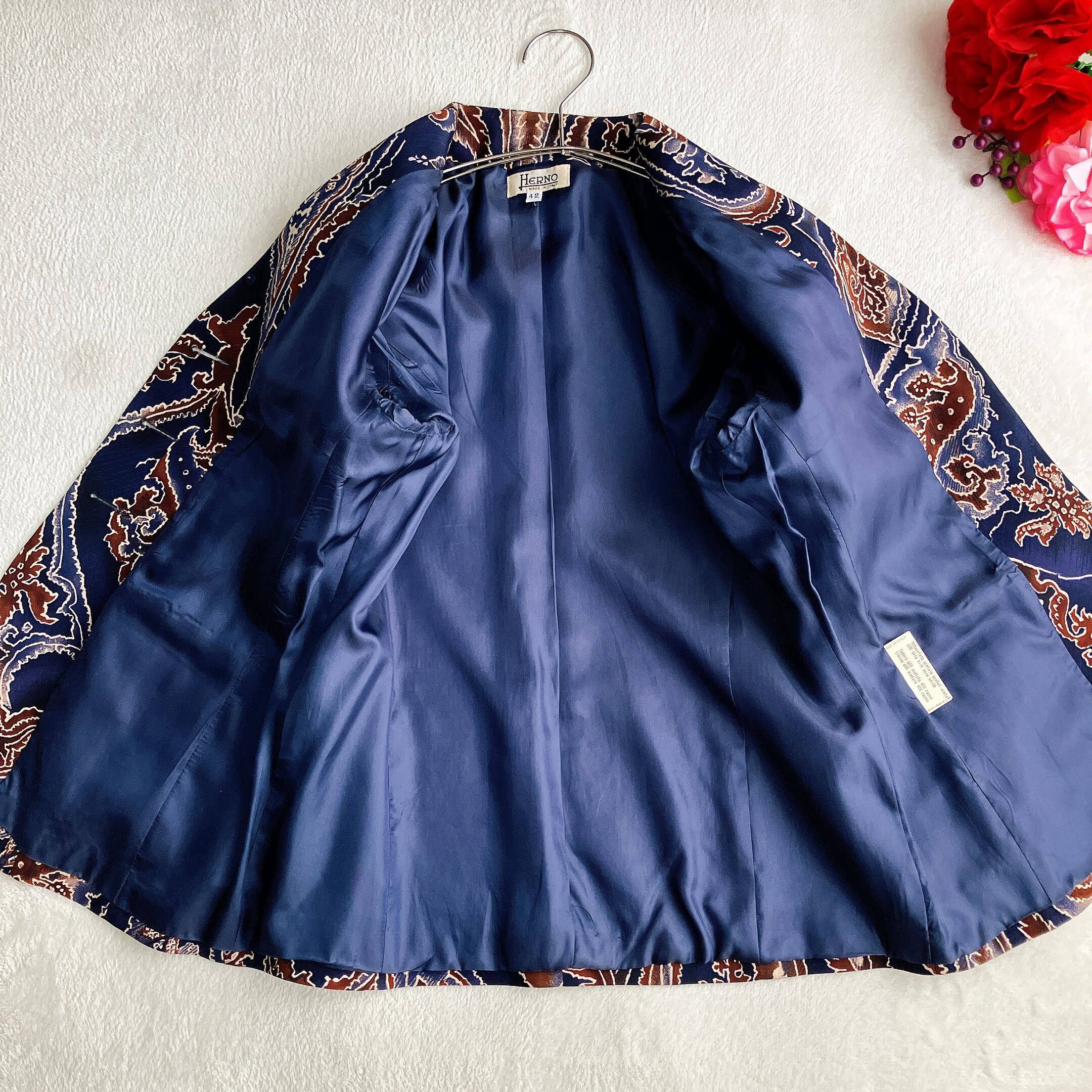 【美品】ヘルノ HERNO★シルク 総柄 ノーカラージャケット Vネック ペイズリー イタリア製 ネイビー×マルチ