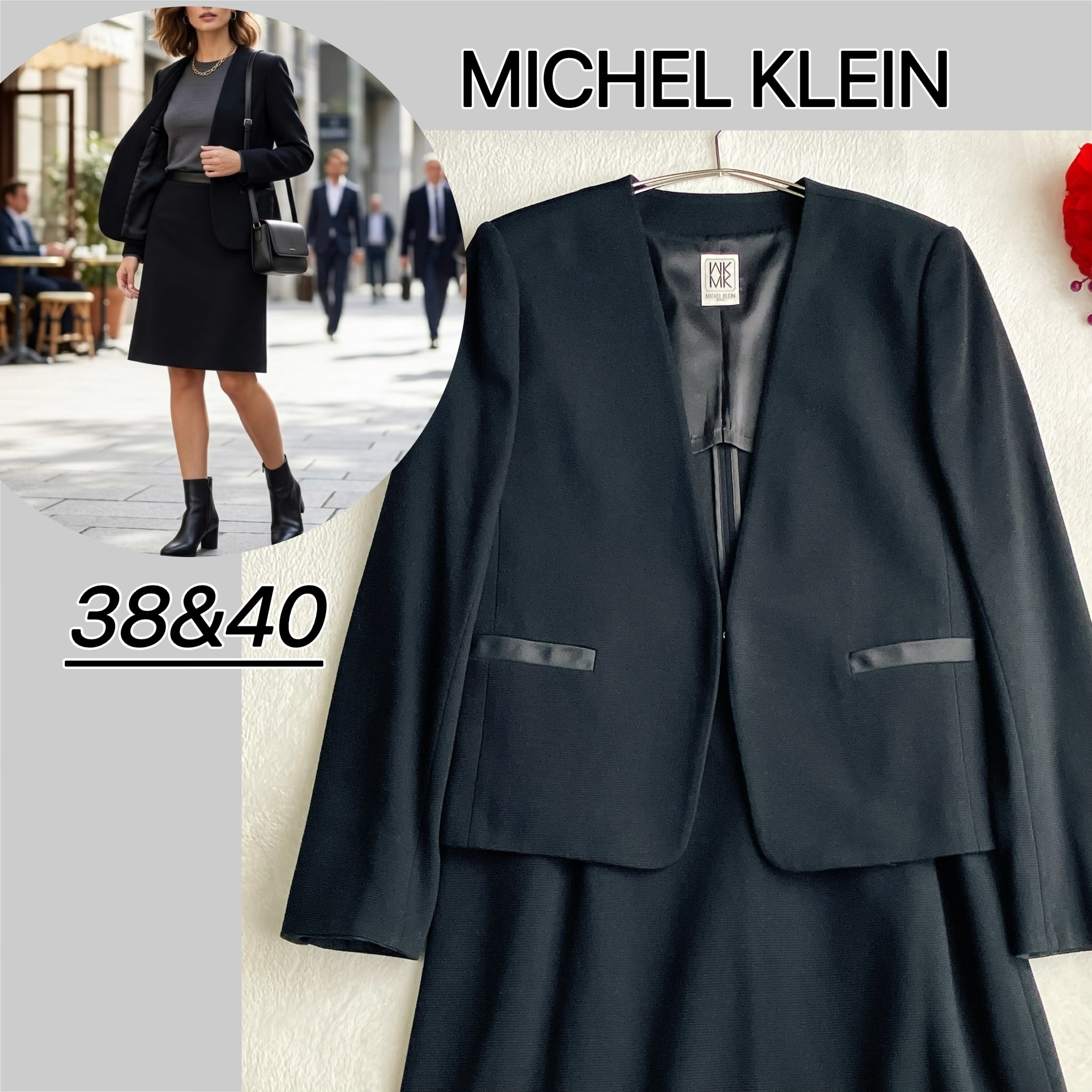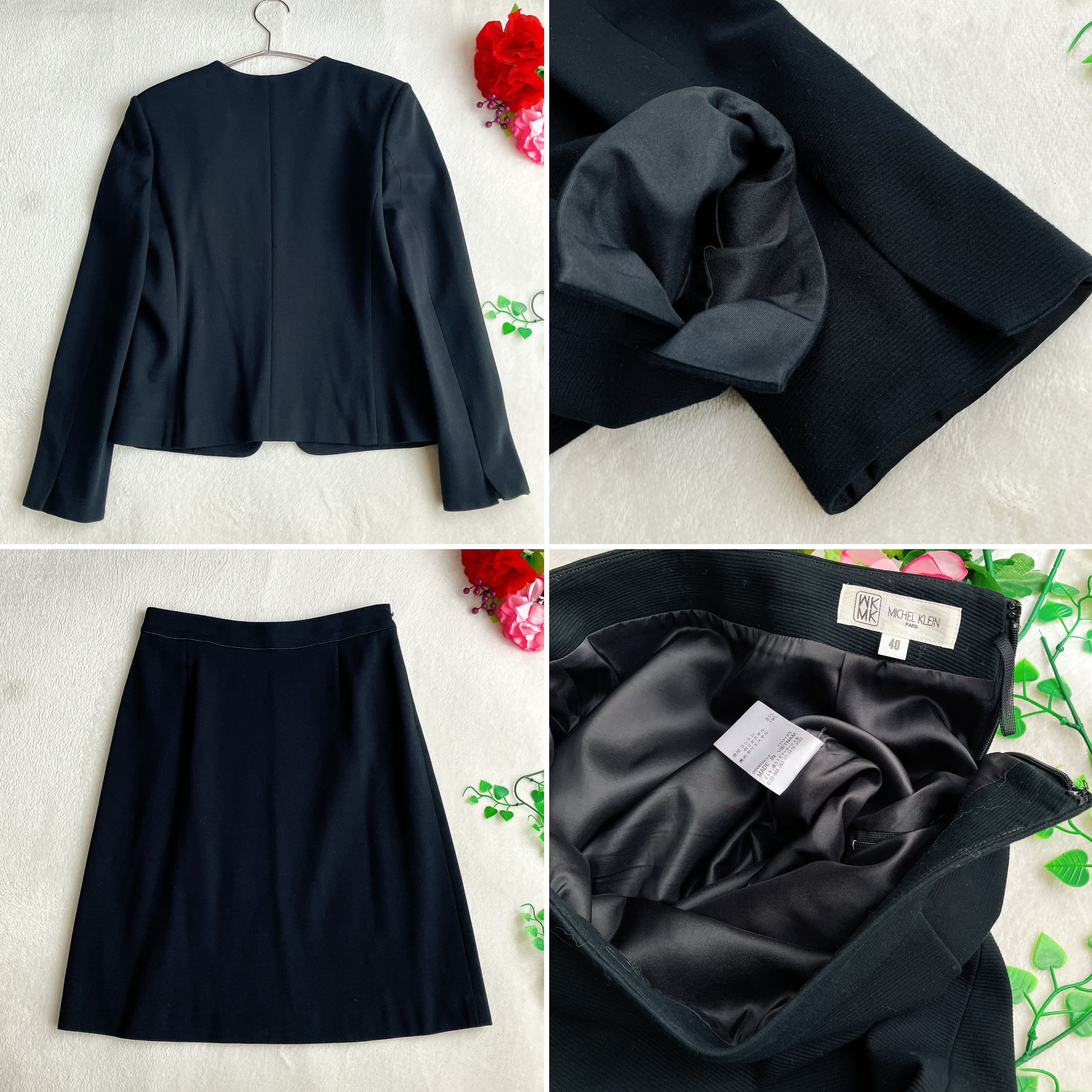 MICHEL KLEIN ミッシェルクラン★ノーカラー スカートスーツ Vネック Aライン セレモニー ブラック