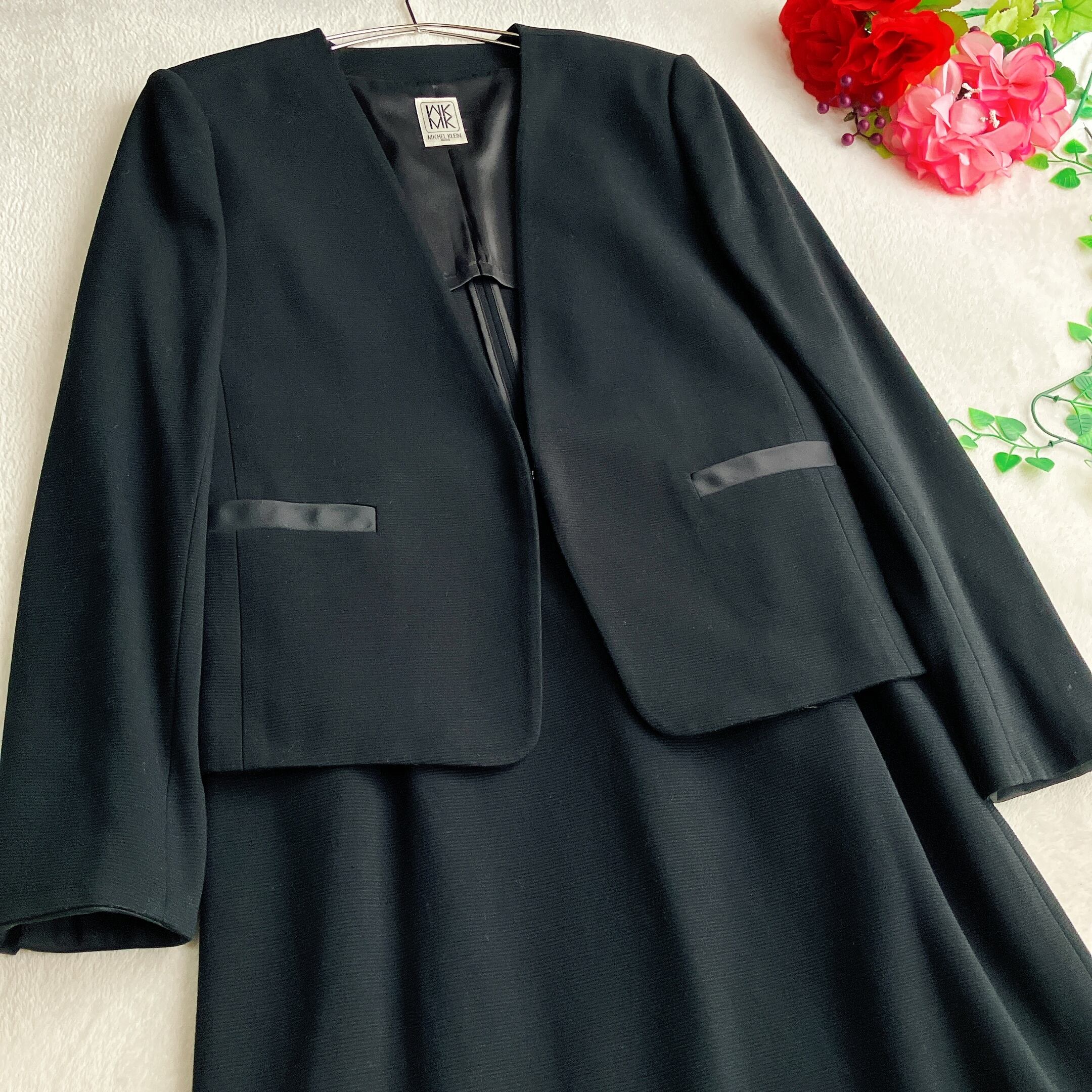 【美品】【手洗い可】MICHEL KLEIN ミッシェルクラン★ノーカラー スカートスーツ Vネック Aライン セレモニー ブラック
