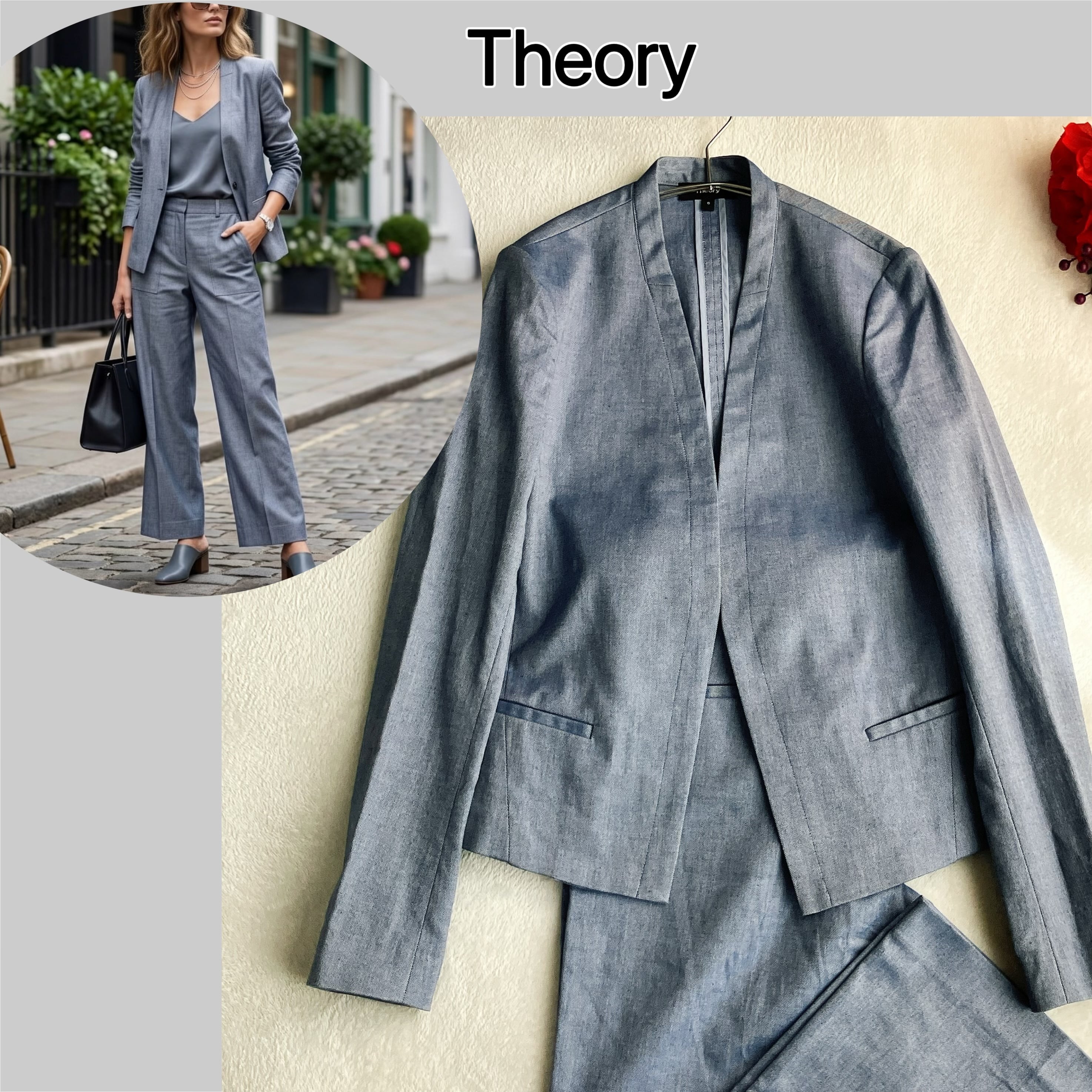 人気ブランドのTheoryらしい、シンプルで上品なノーカラー×Vネックジャケットのセットアップ。顔まわりをすっきり見せるデザインで、オフィス・通勤・セレモニー・ビジネスシーンまで幅広く活躍するレディースパンツスーツです。