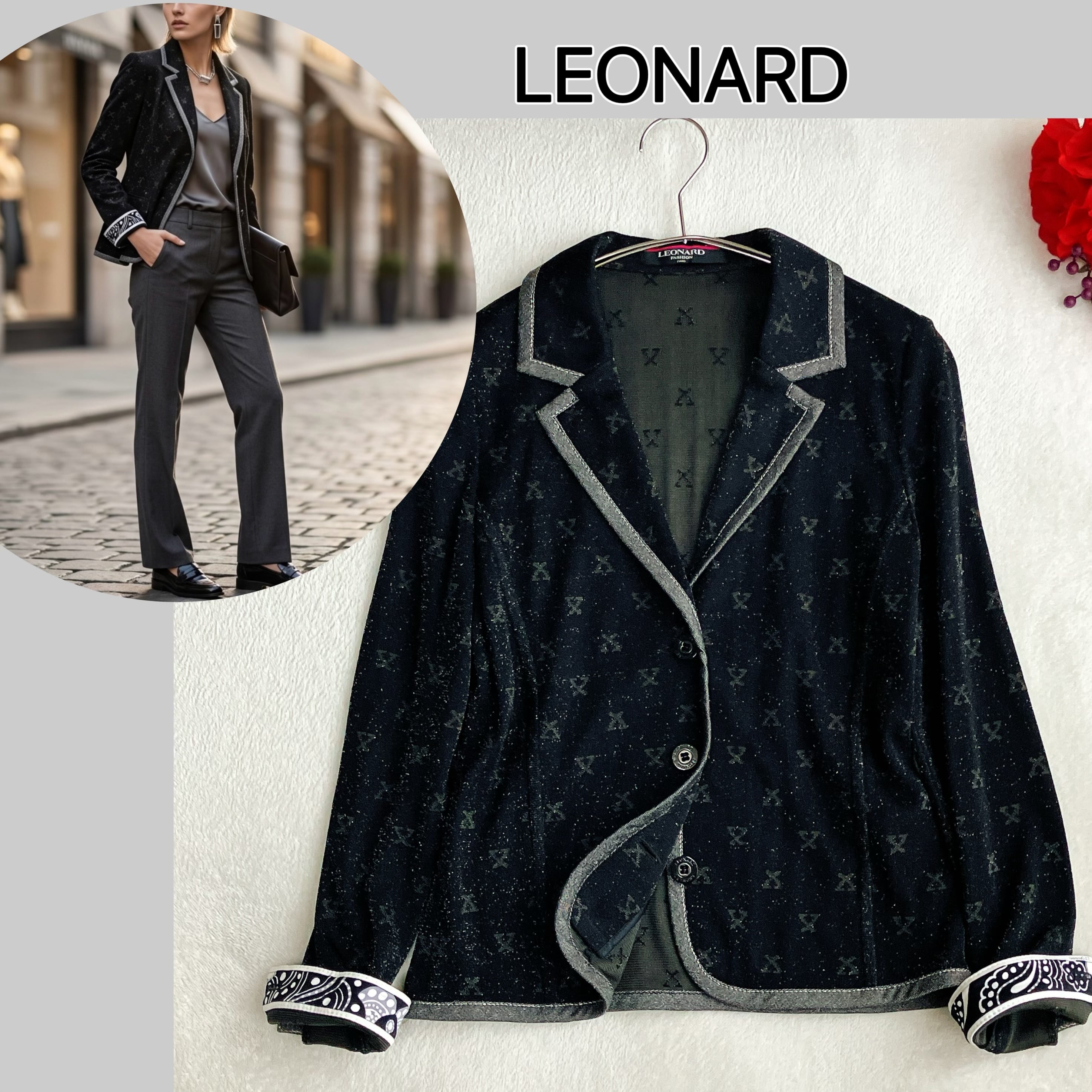 シルク素材ならではの上品な光沢感に加え、さりげないラメが華やかさをプラス。総柄ロゴデザインが印象的で、ラグジュアリー感のあるテーラードジャケットとしてコーデの主役に。高級ブランド・レオナールならではのエレガントな一着です。