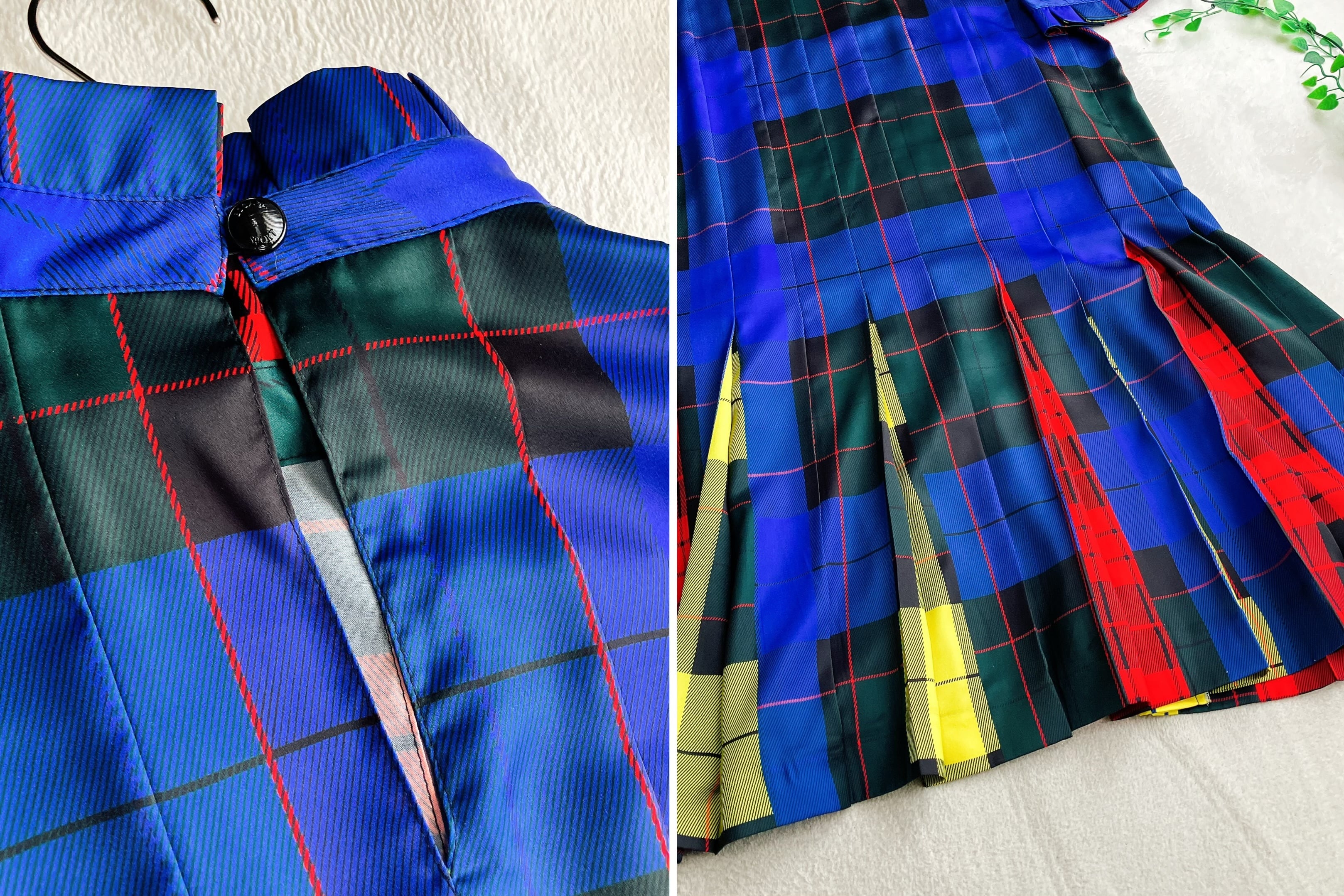 ①ドイツ発ラグジュアリーブランド ESCADA の上品さが際立つマーメイドロングワンピース。タータンチェック×マルチカラーの華やかなデザインで、一枚で主役級の存在感を演出します。