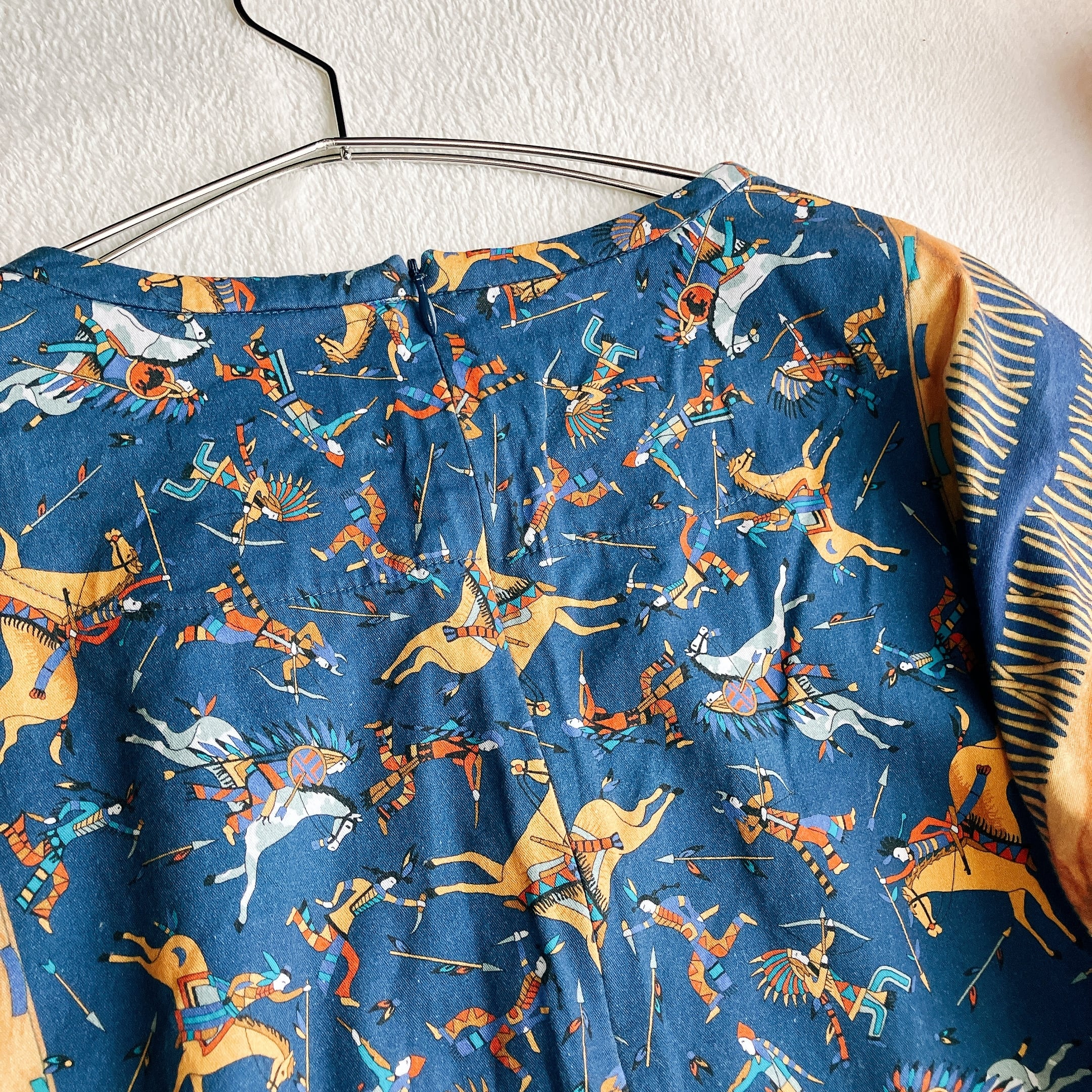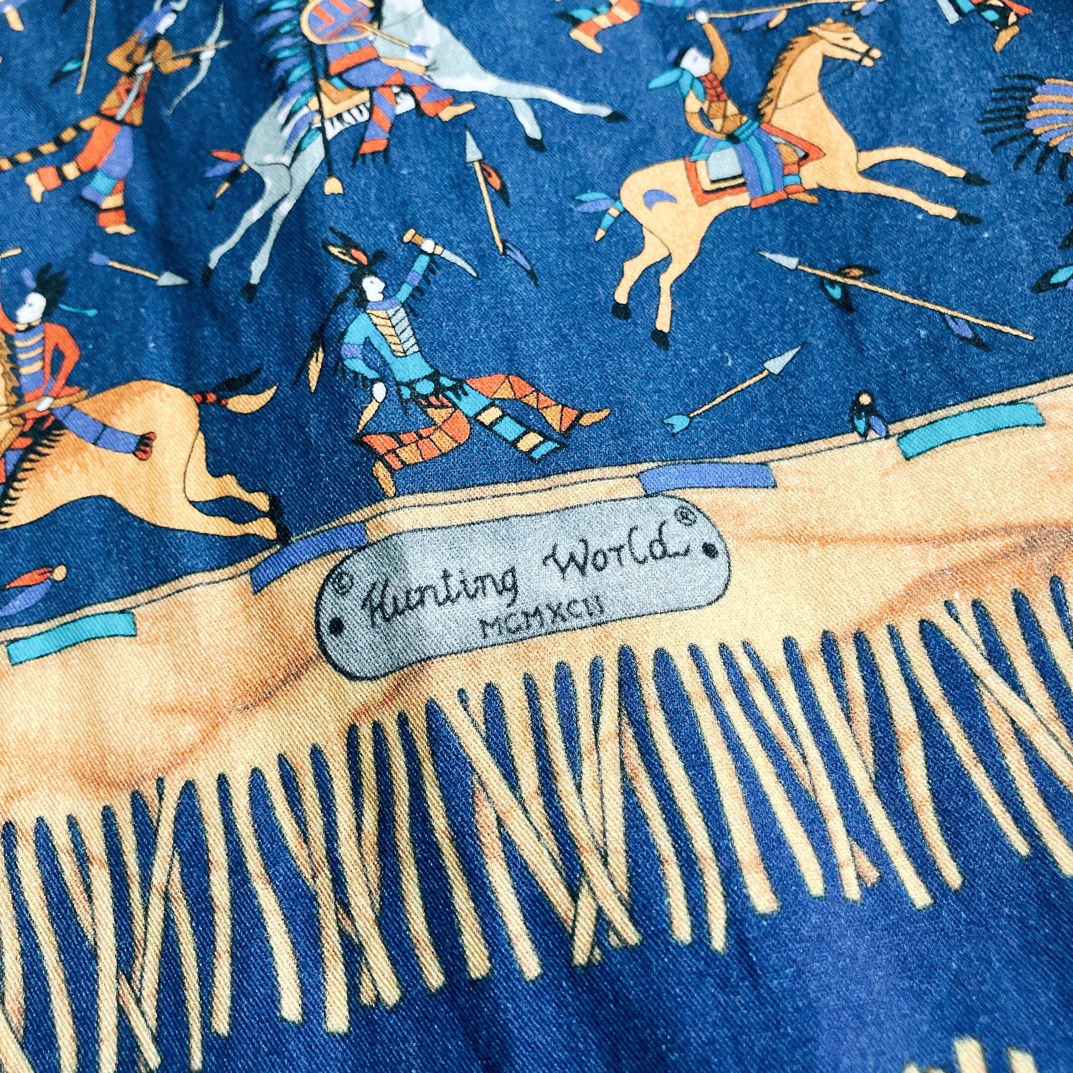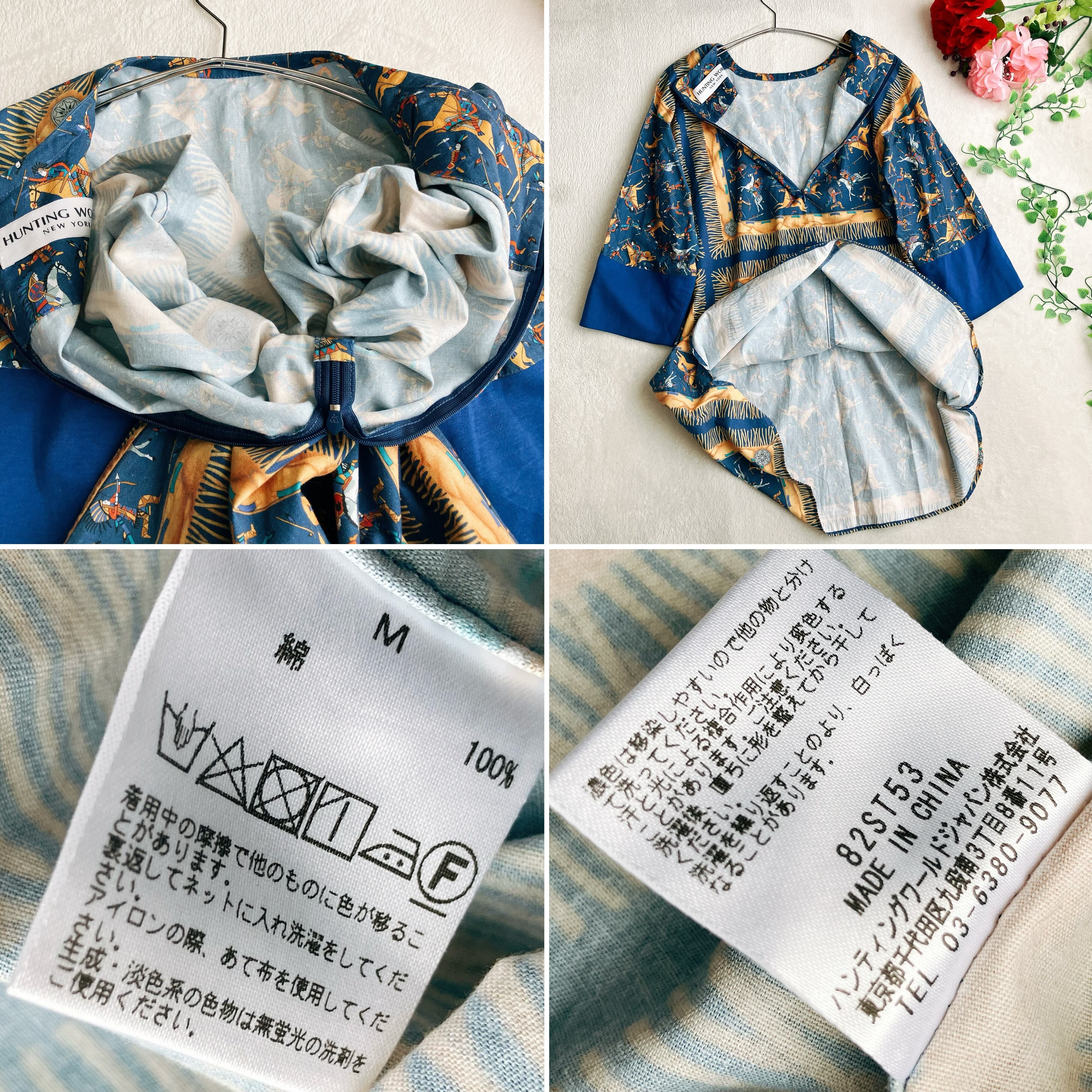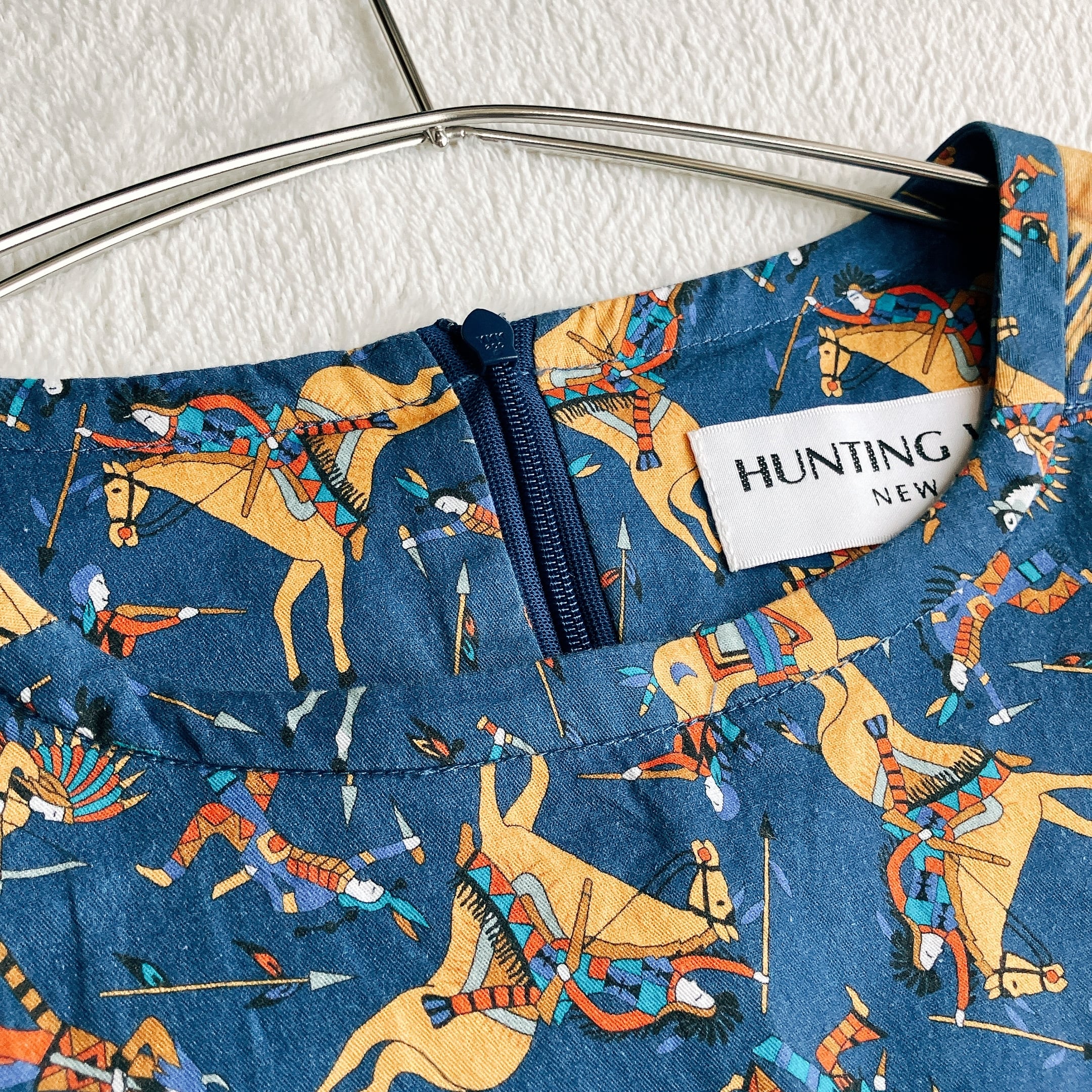 【美品】【手洗い可】HUNTING WORLD ハンティングワールド★ボリューム袖 スカーフ柄 チュニック エスニック 総柄 ロゴ ブルー系