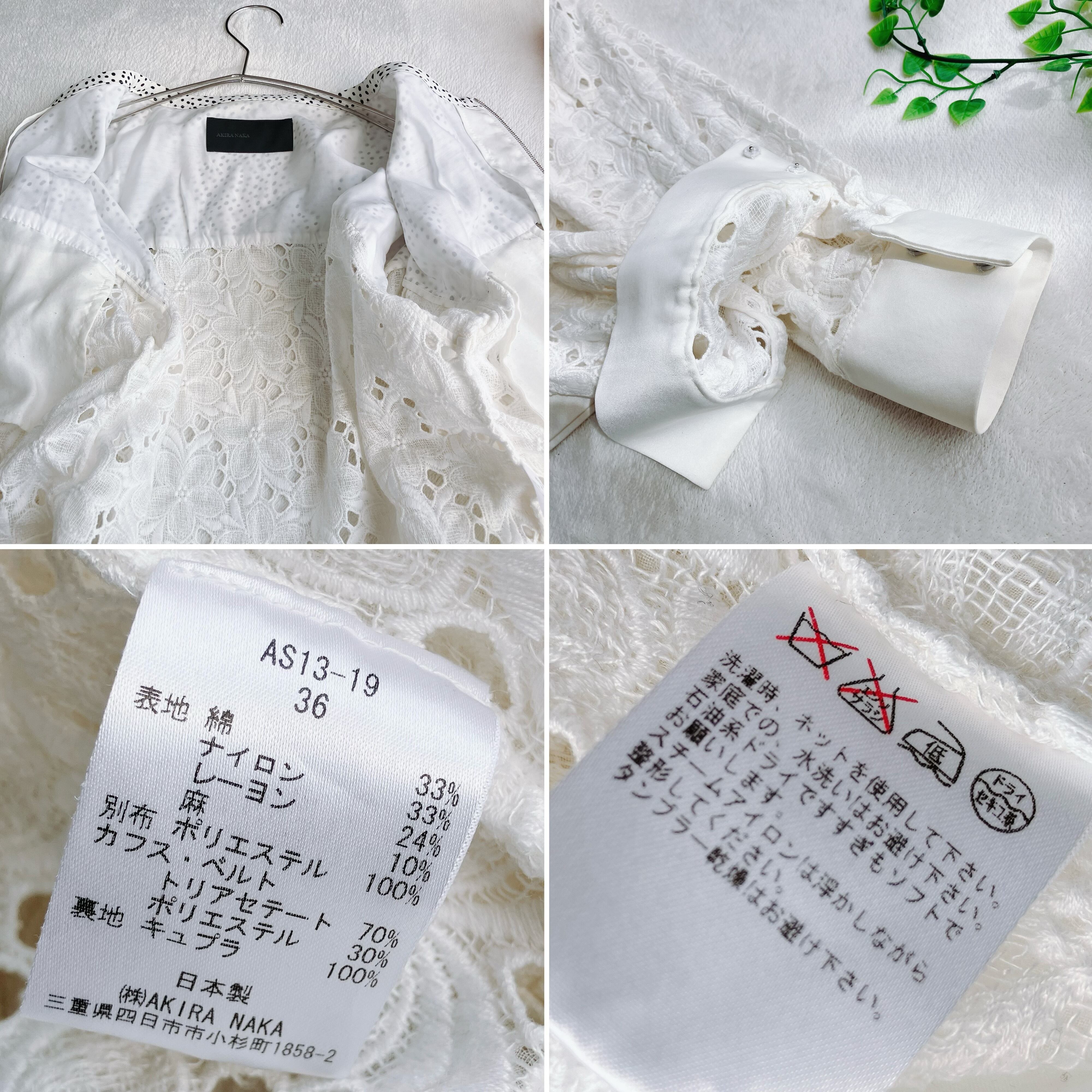 【美品】AKIRANAKA アキラナカ 異素材切替え ノーカラージャケット 花柄レース ドロップショルダー ブルゾン リネン混 ドット柄 ホワイト系
