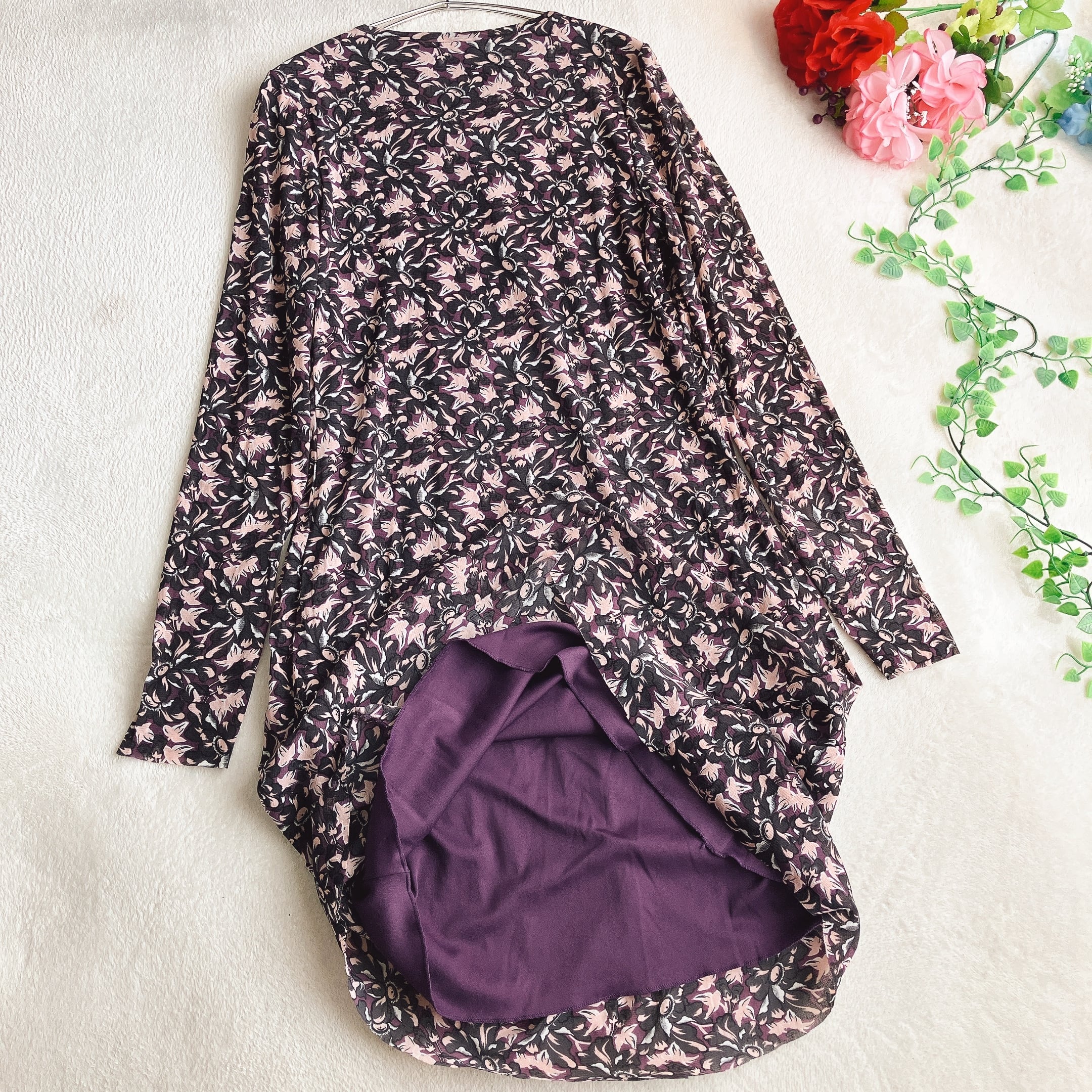 VIVIENNE TAMならではの繊細な花柄デザインが魅力。パープル×ピンクのマルチカラーが大人可愛く、パワーネット素材で軽やか&ストレッチ性抜群。着心地の良さと華やかさを兼ね備えたワンピースです。
