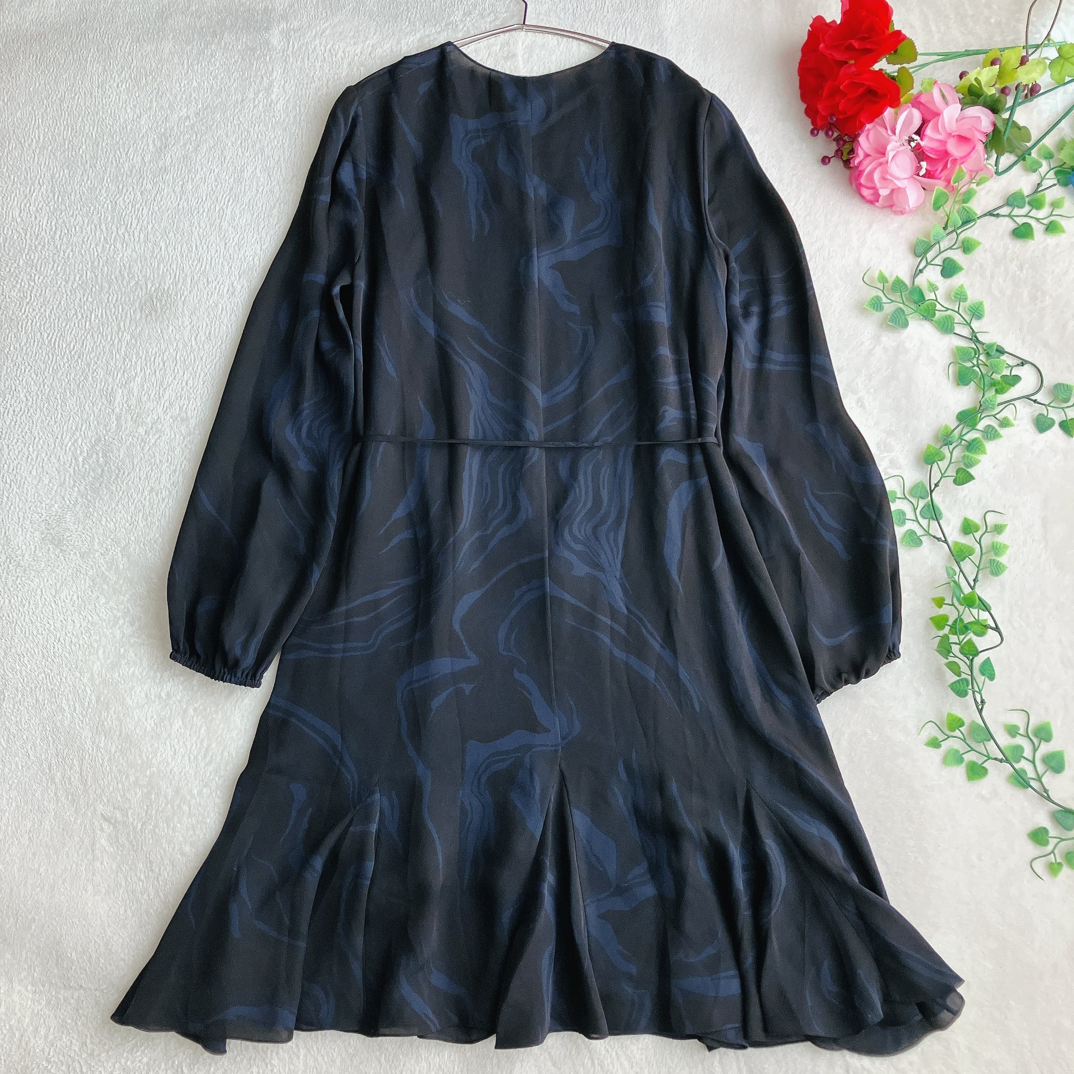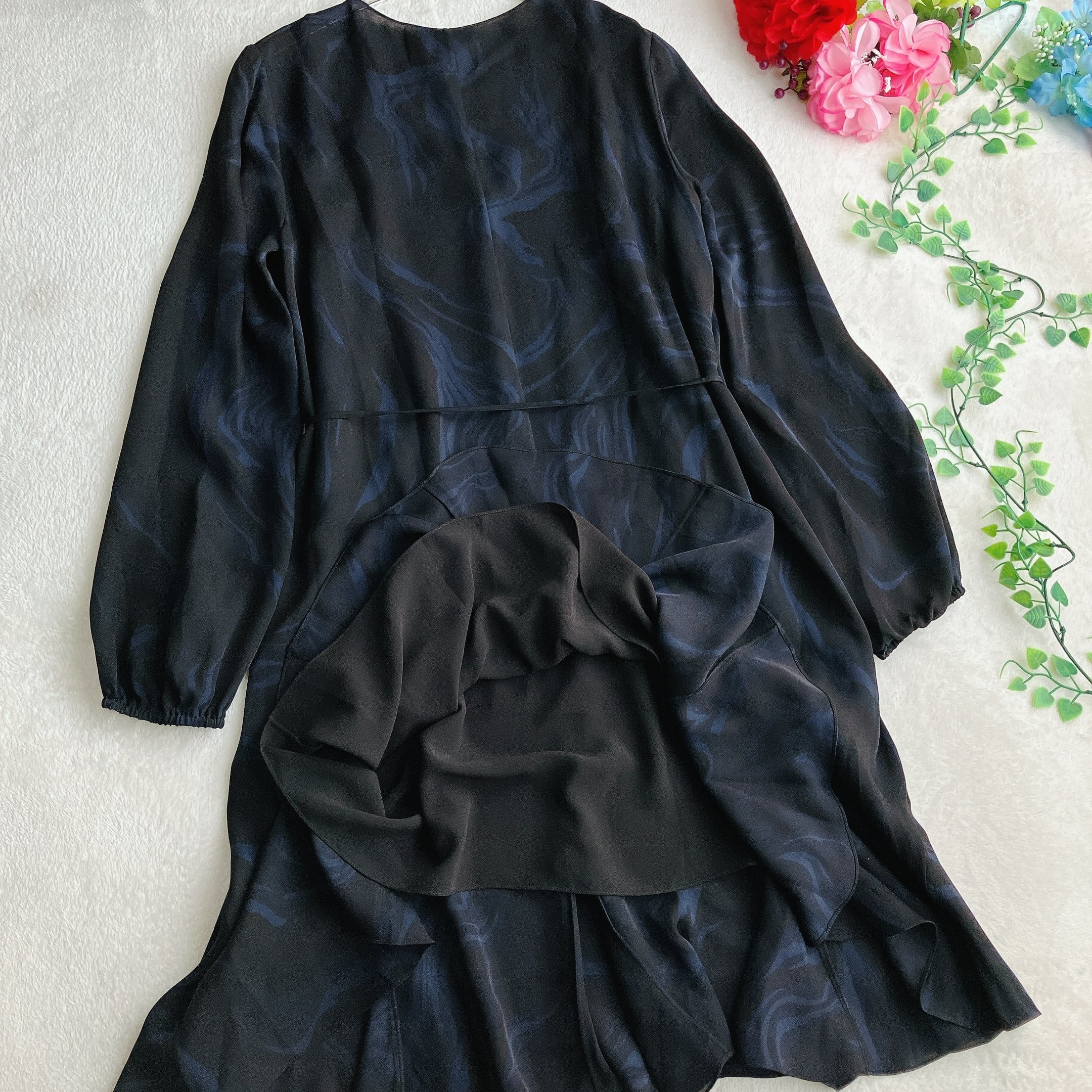 【極美品】【インナー付き】Theory セオリー★シルク100% フレア ワンピース シアー 総柄 ボリューム袖 ベルト付き ブラック×ネイビー系