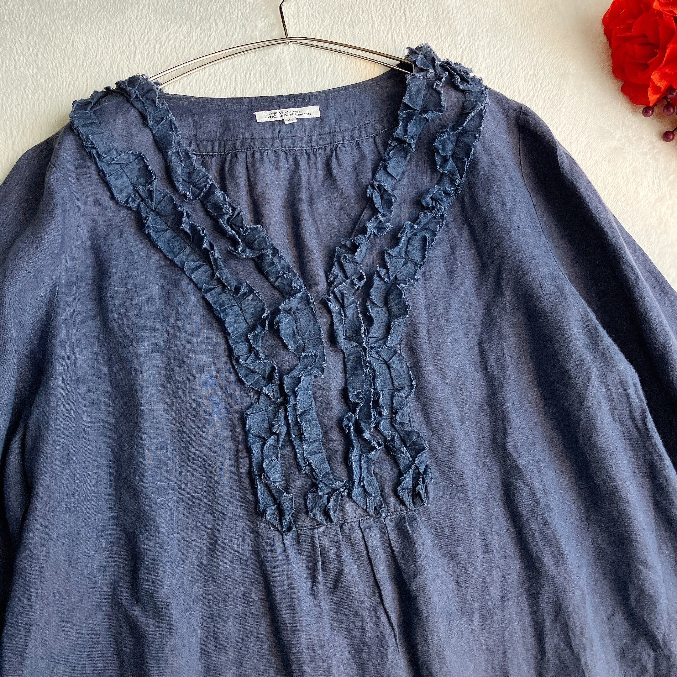 23区 リネン100% ボリューム袖 フリル チュニック Vネック パープル系