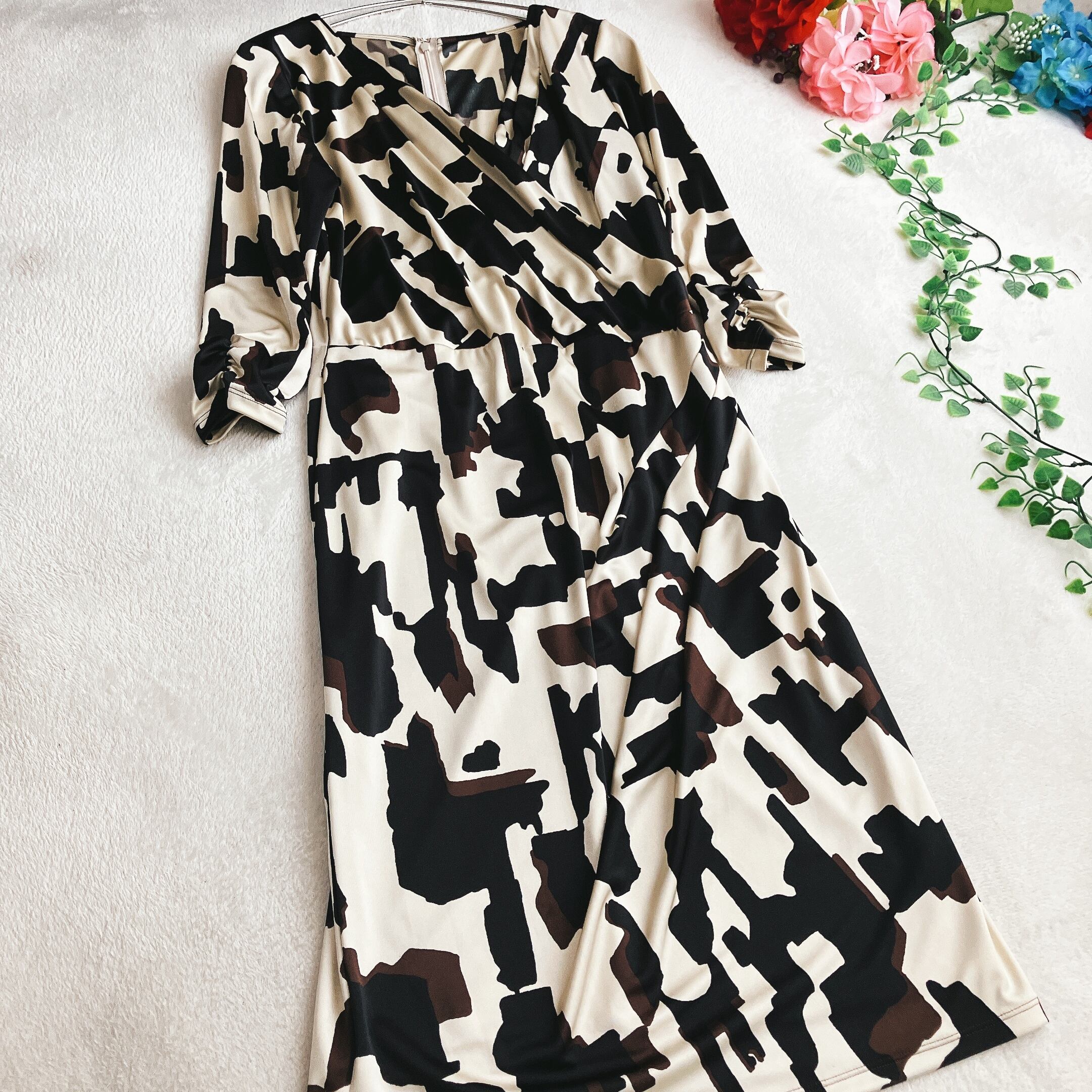 【美品】MATERIA マテリア★カシュクール ワンピース ジオメトリック 総柄 ドレス ドレープ オフホワイト×マルチ