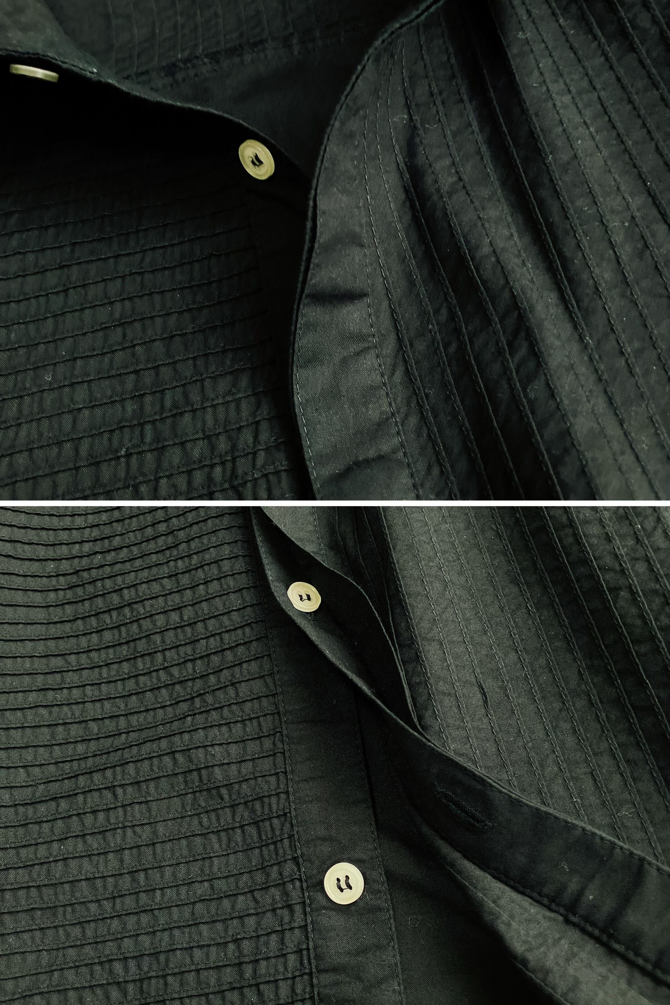 YACCOMARICARDならではの繊細なピンタック加工のアシンメトリーが魅力のデザインシャツ。シンプルなブラックながらも立体感があり、「ピンタックシャツ」「デザインシャツ」「モード系」などでお探しの方におすすめです。