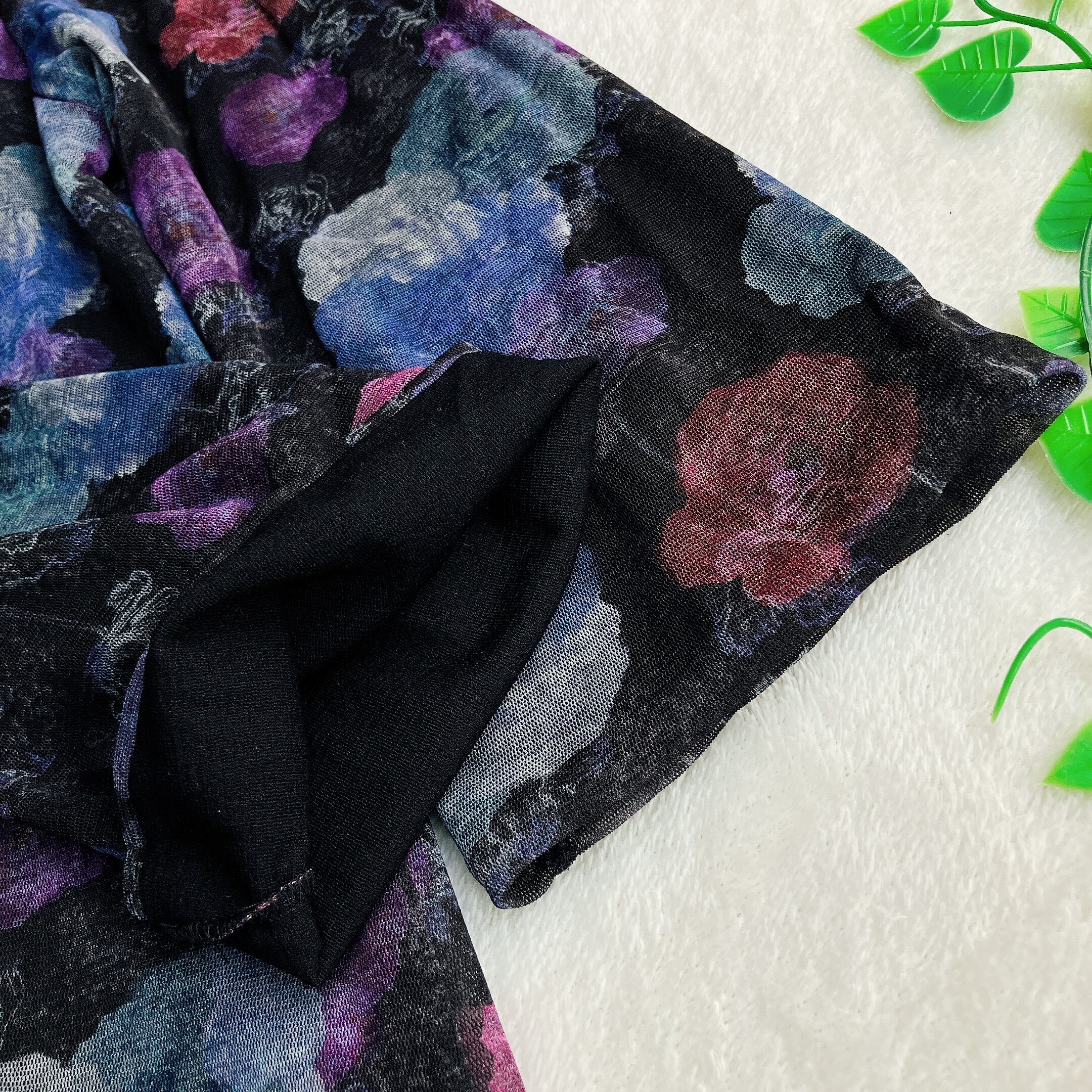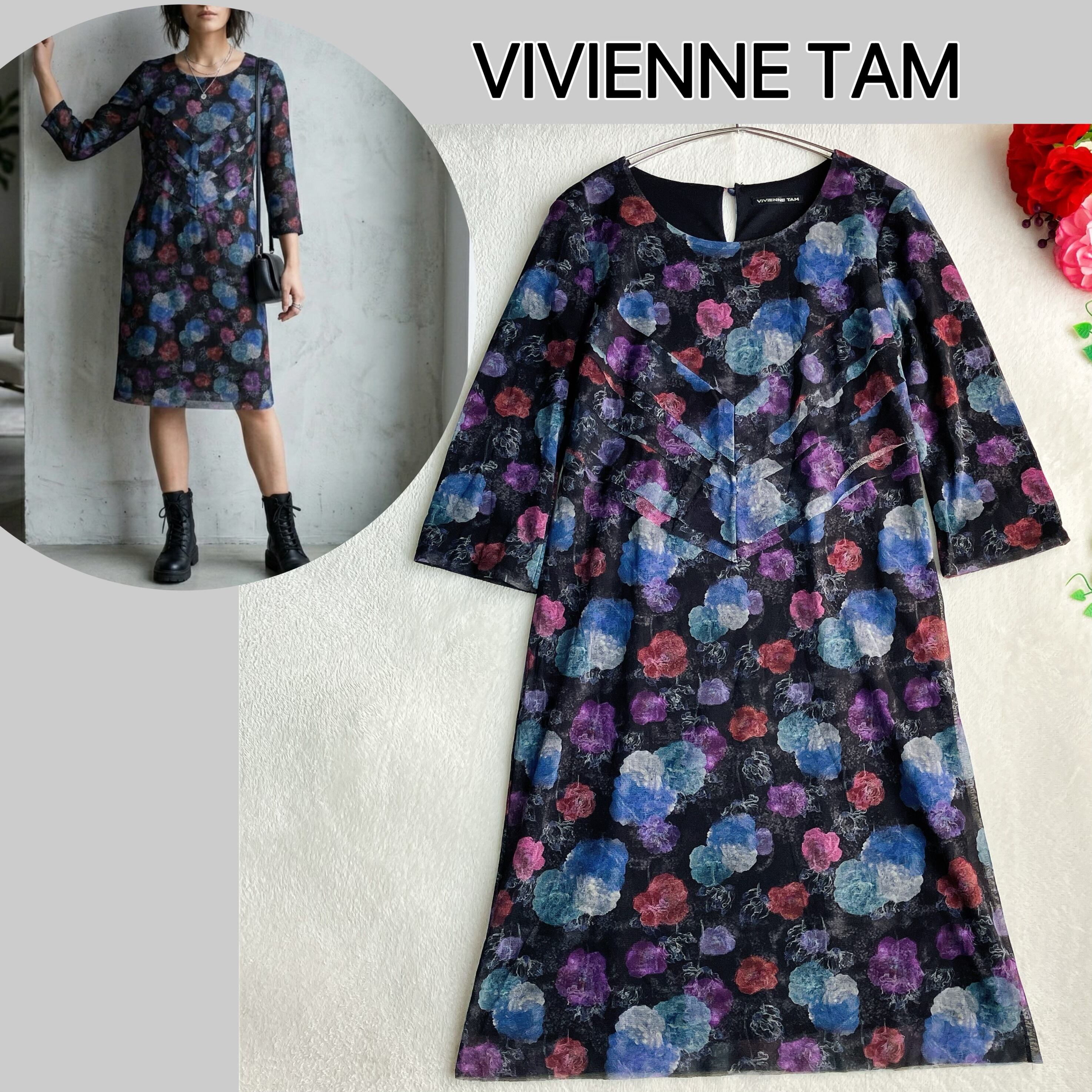 VIVIENNE TAMならではの洗練された花柄総柄デザイン。ブラックベースにマルチカラーが映え、シアー感のあるパワーネット素材が大人フェミニンな印象を演出します。