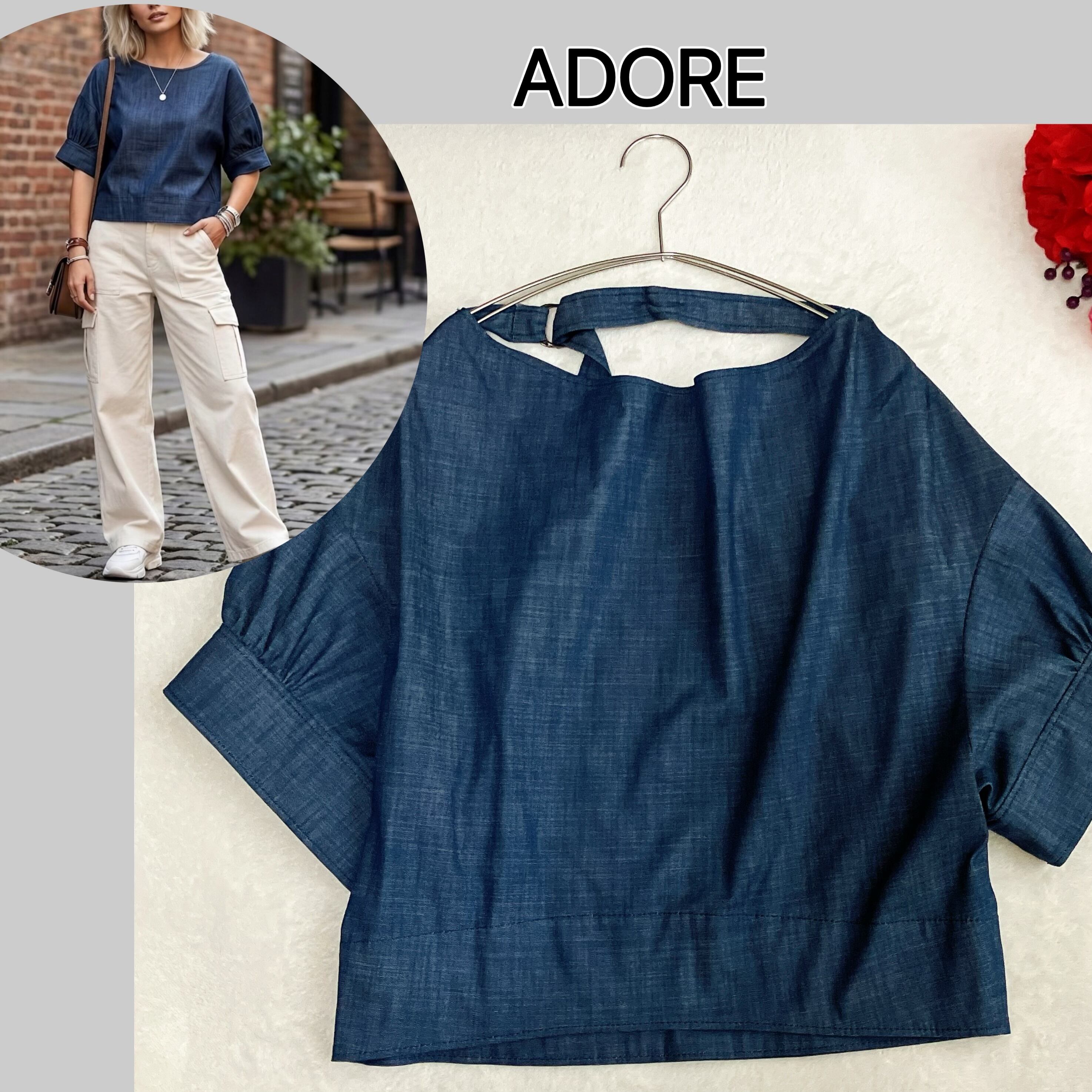 ADORE アドーア★スラブデニムバックネックベルトブラウス ギャザー ボリューム袖 ボックスシルエット ドロップショルダー ストレッチ ネイビー系