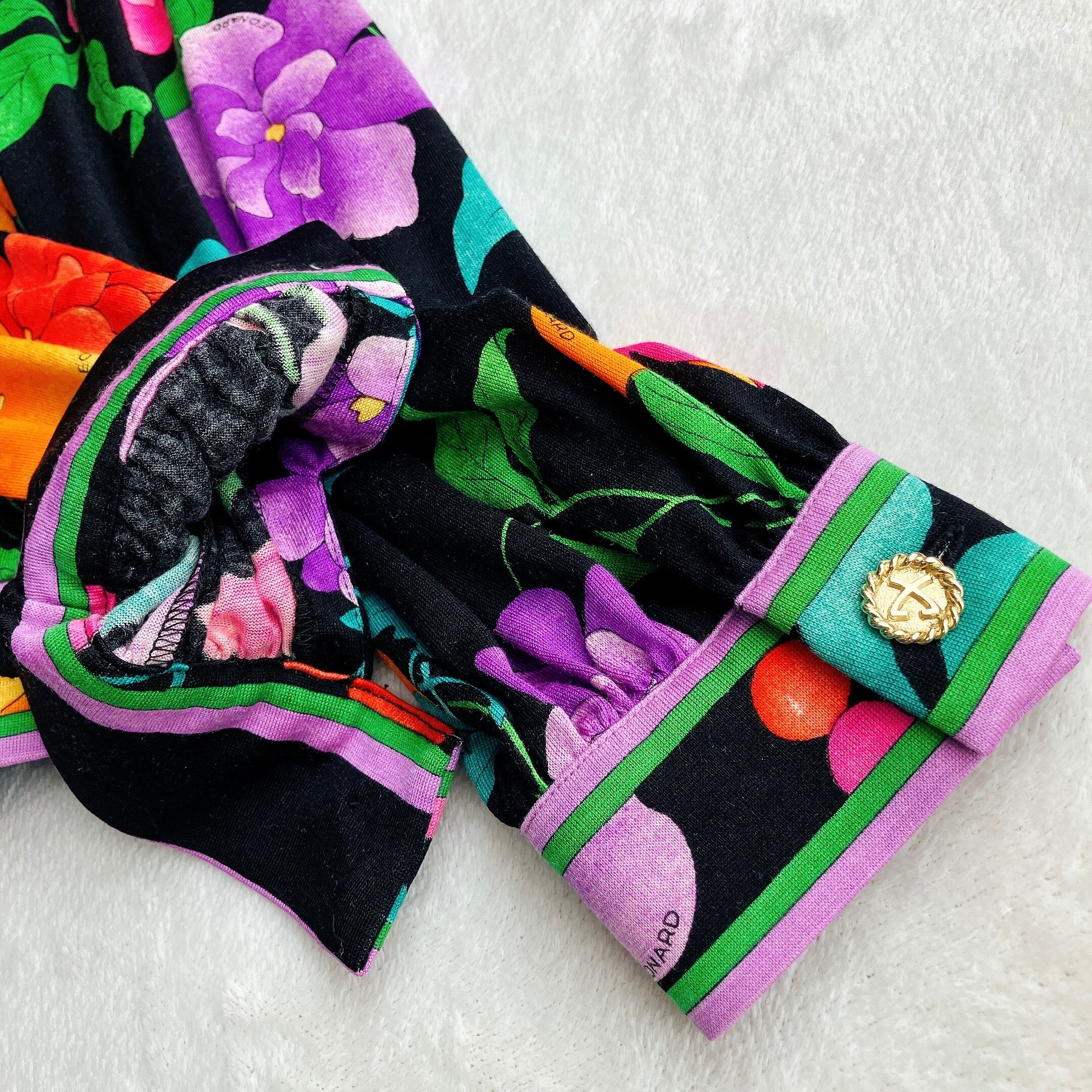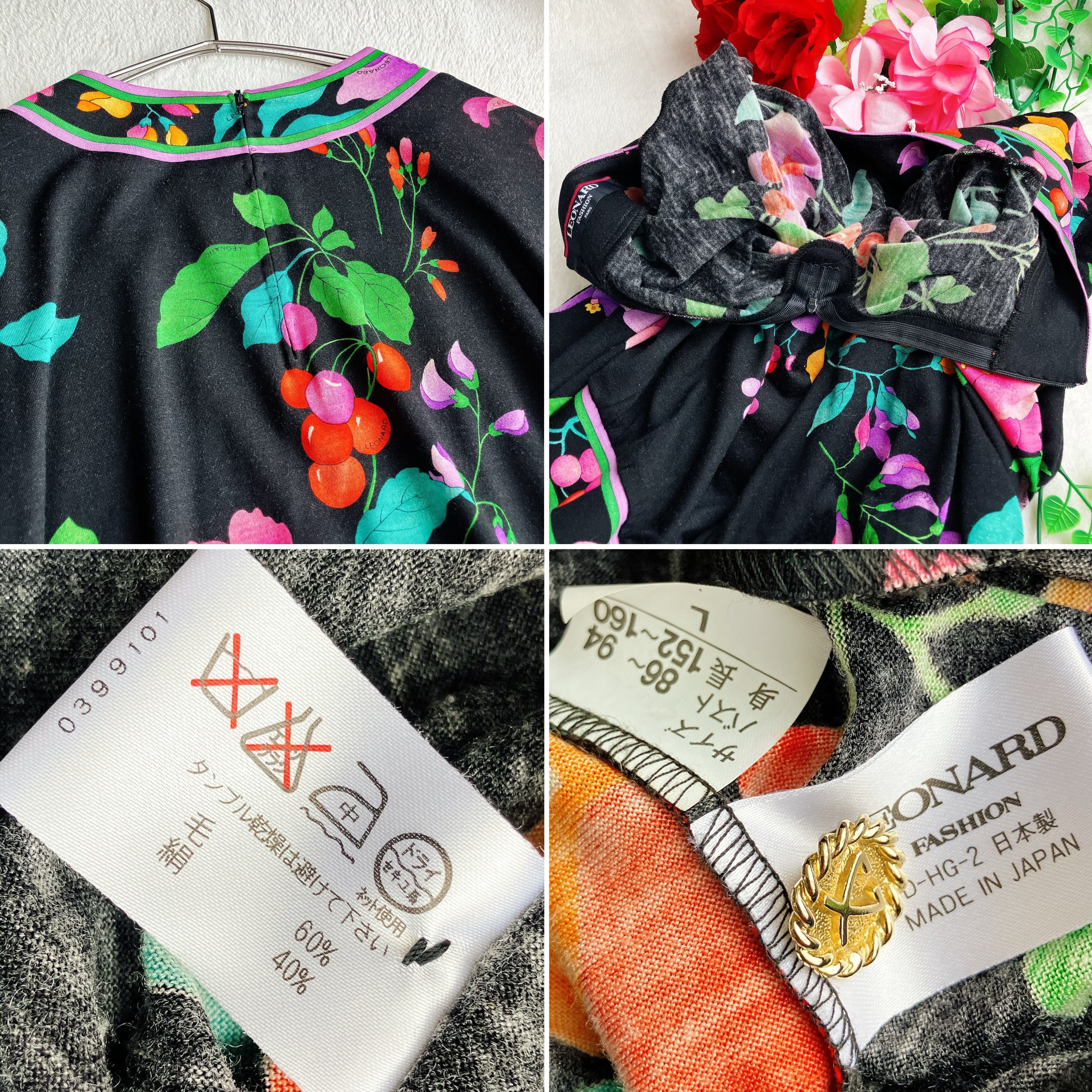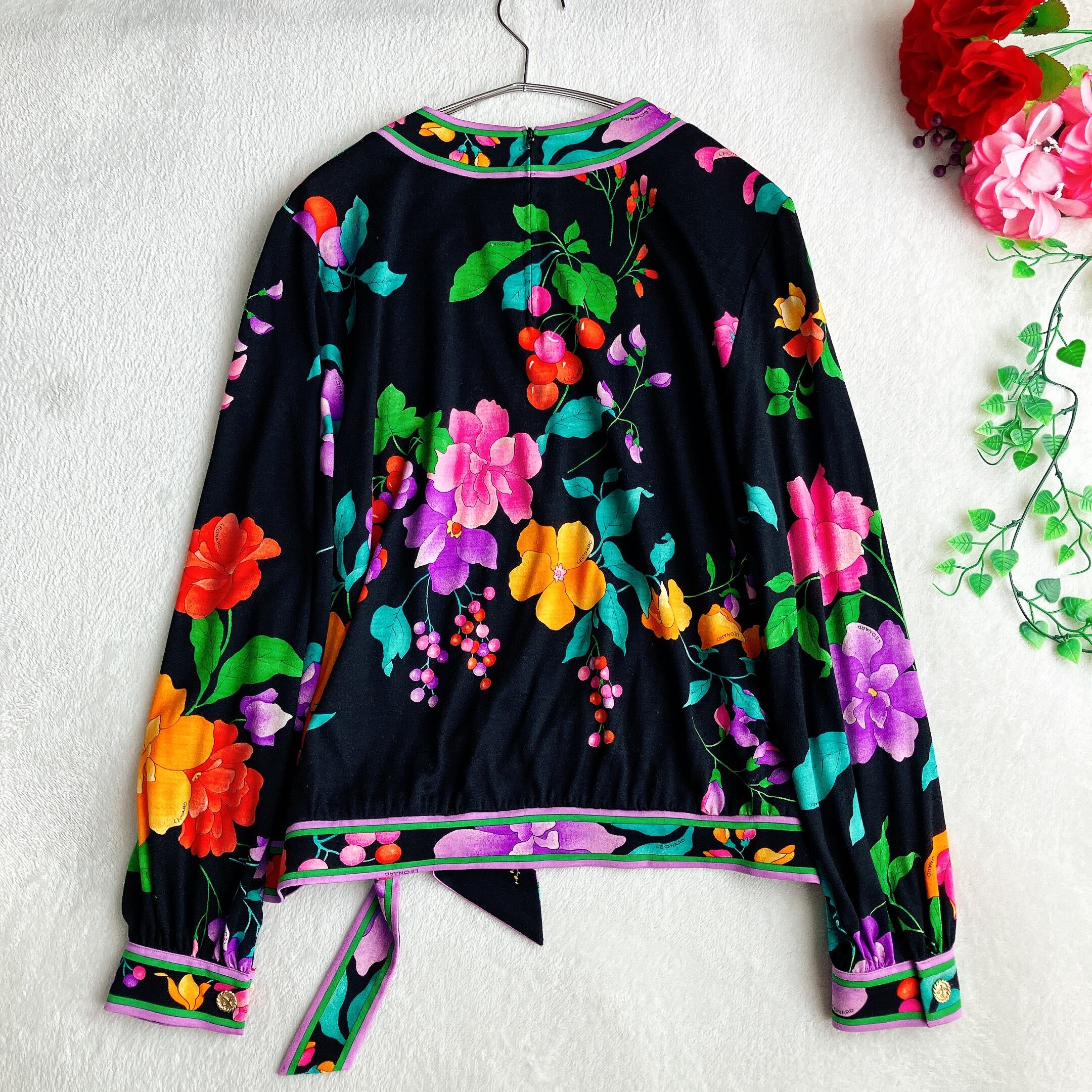 【美品】LEONARD レオナール★シルク 花柄 トリム カットソー 金ボタン リボン 総柄 ギャザー ブラック×マルチ