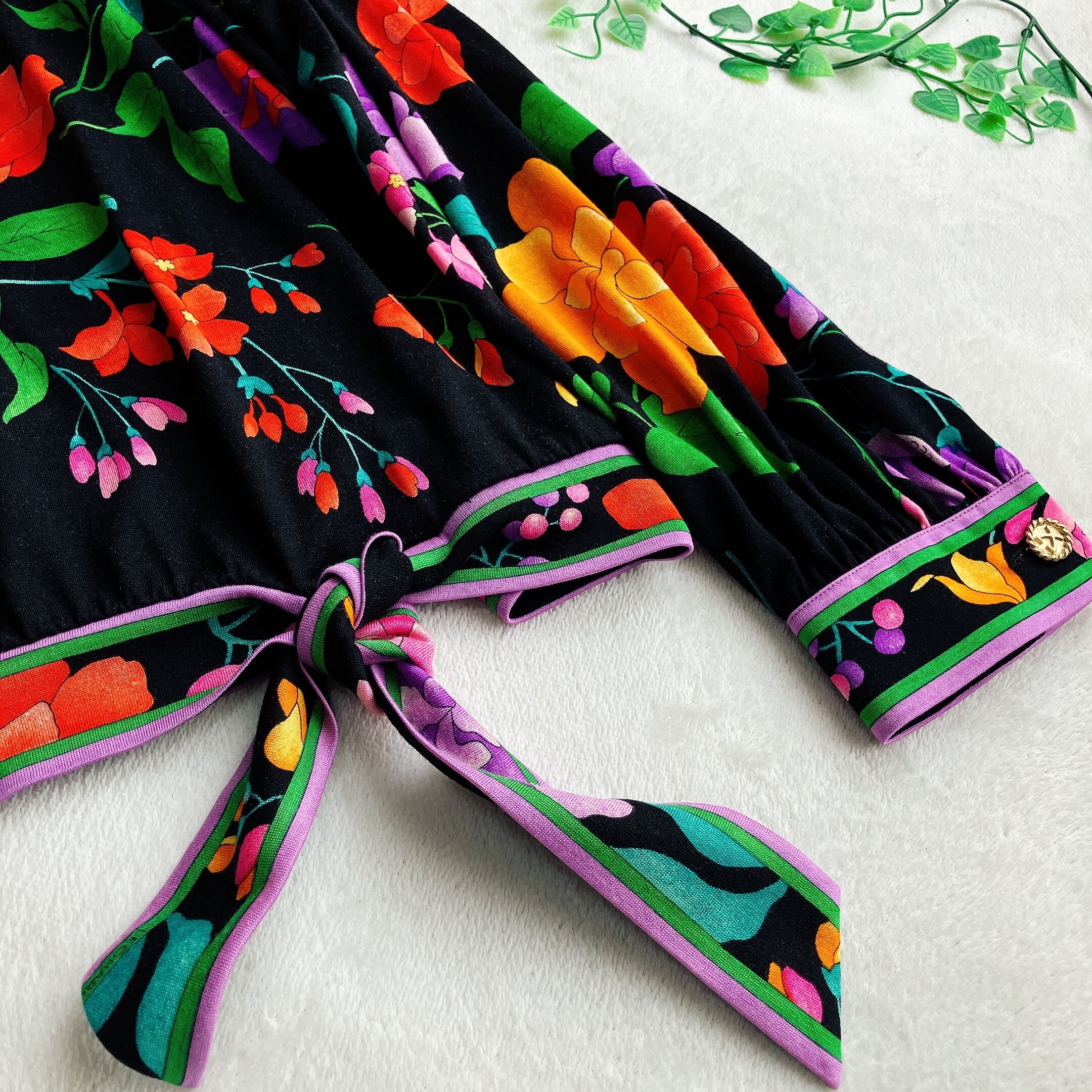 LEONARD レオナール★シルク 花柄 トリム カットソー 金ボタン リボン 総柄 ギャザー ブラック×マルチ