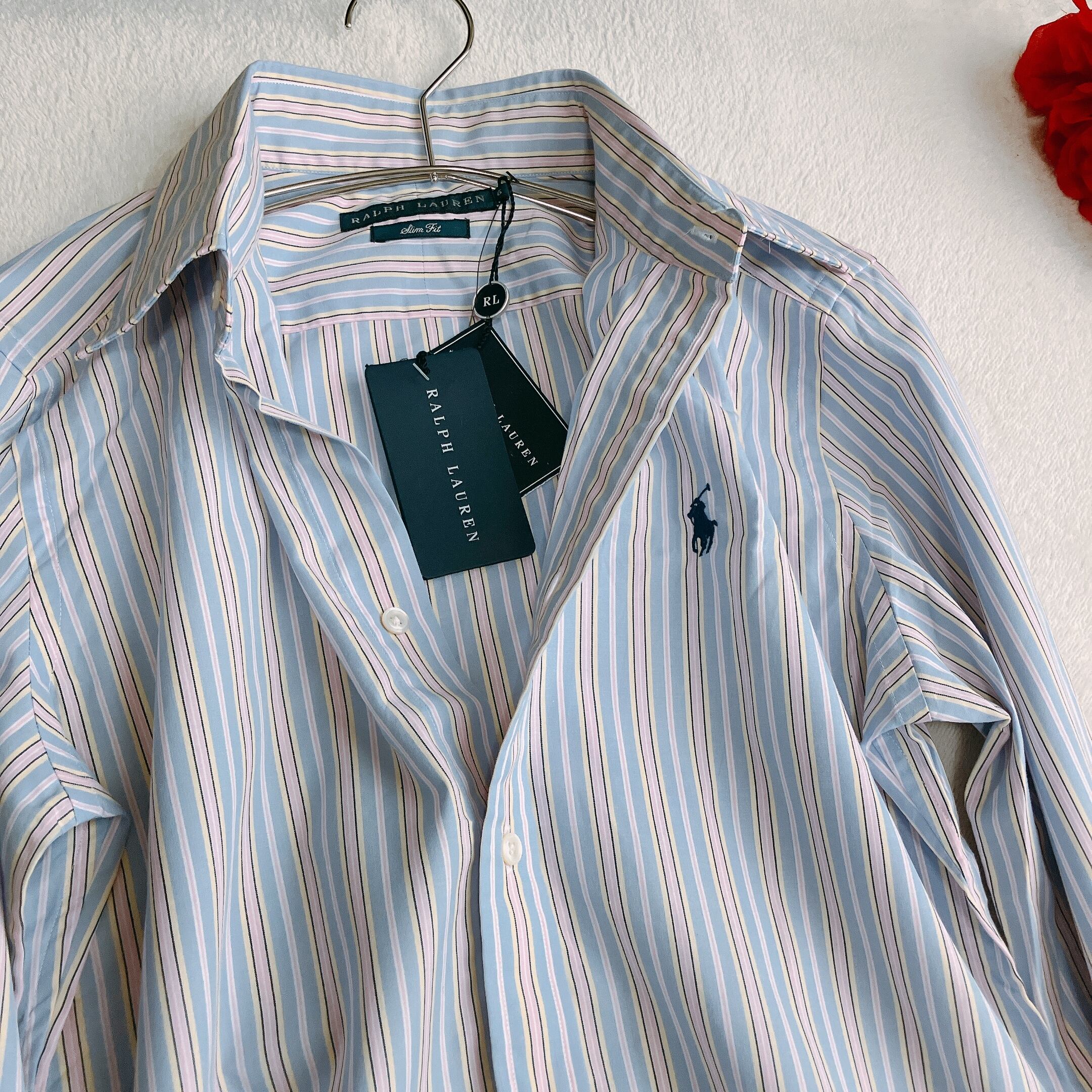 【未使用タグ付き/洗える】RALPH LAUREN ラルフローレン★ストライプシャツ 長袖 カラーキーパー ポニー刺繍 スリムフィット ライトブルー