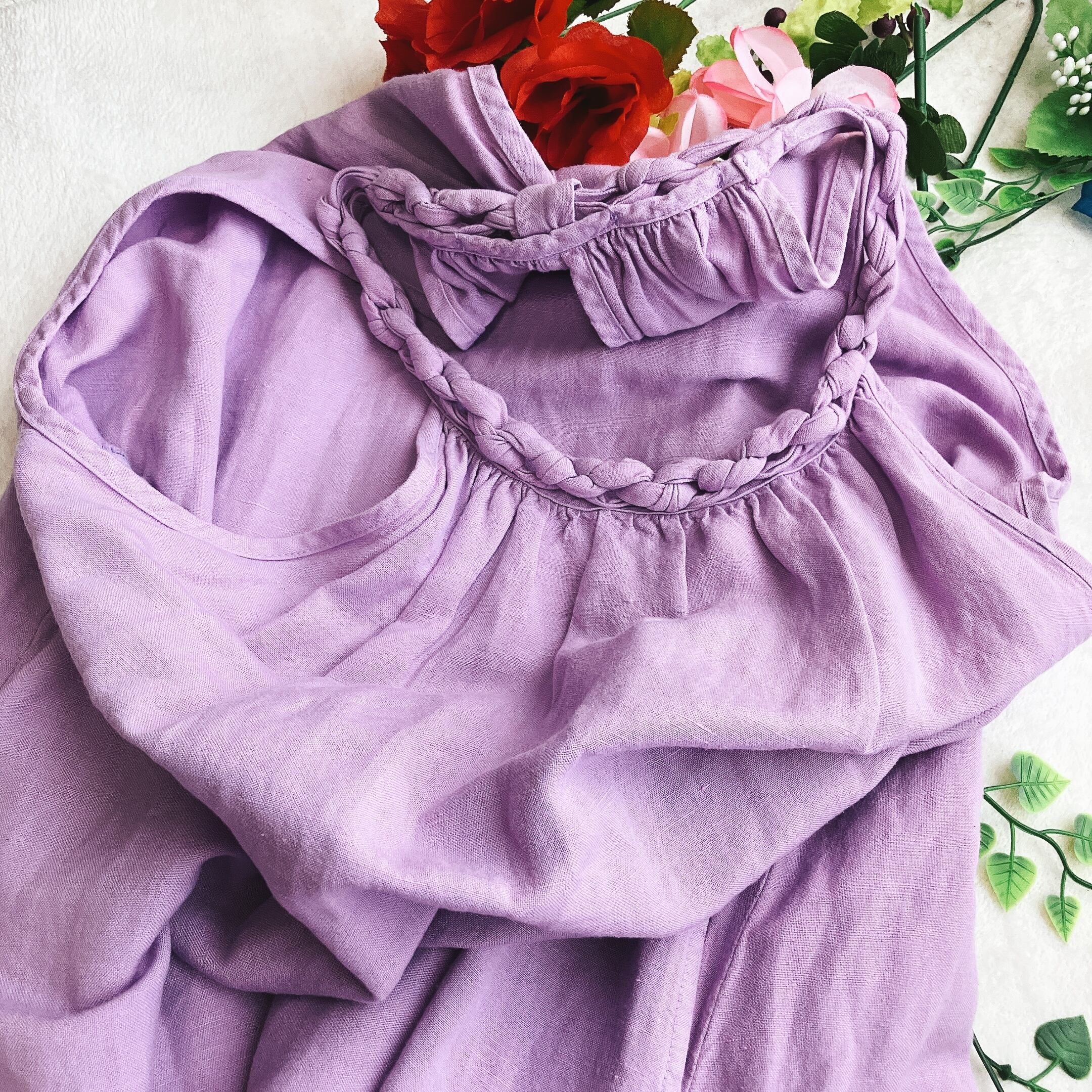 ③手洗い可能なリネン素材でお手入れしやすく、デイリーから旅行まで幅広く活躍。パープル系カラーが女性らしく、ナチュラル・フェミニン・リゾートワンピースをお探しの方におすすめのアイテムです。