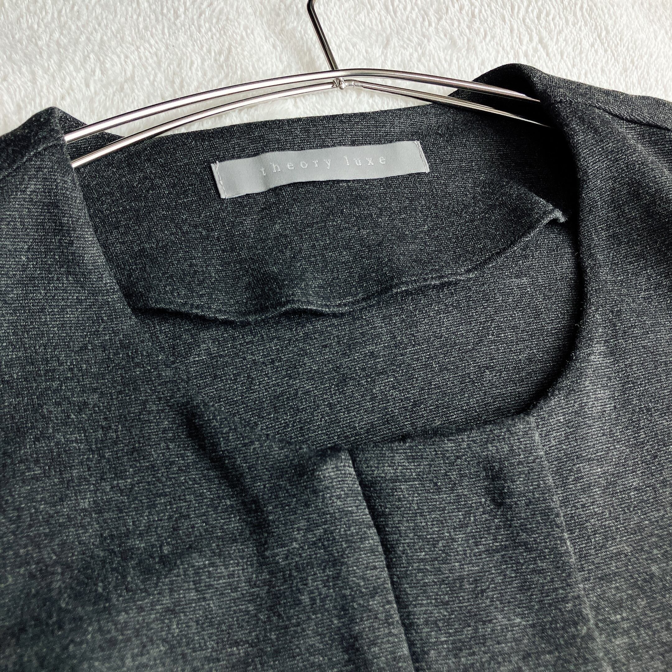 theory luxe セオリーリュクス★ストレッチ ノーカラー スカートスーツ アンコン トラベルスーツ ジップアップ タイトスカート バックスリット ダークグレー