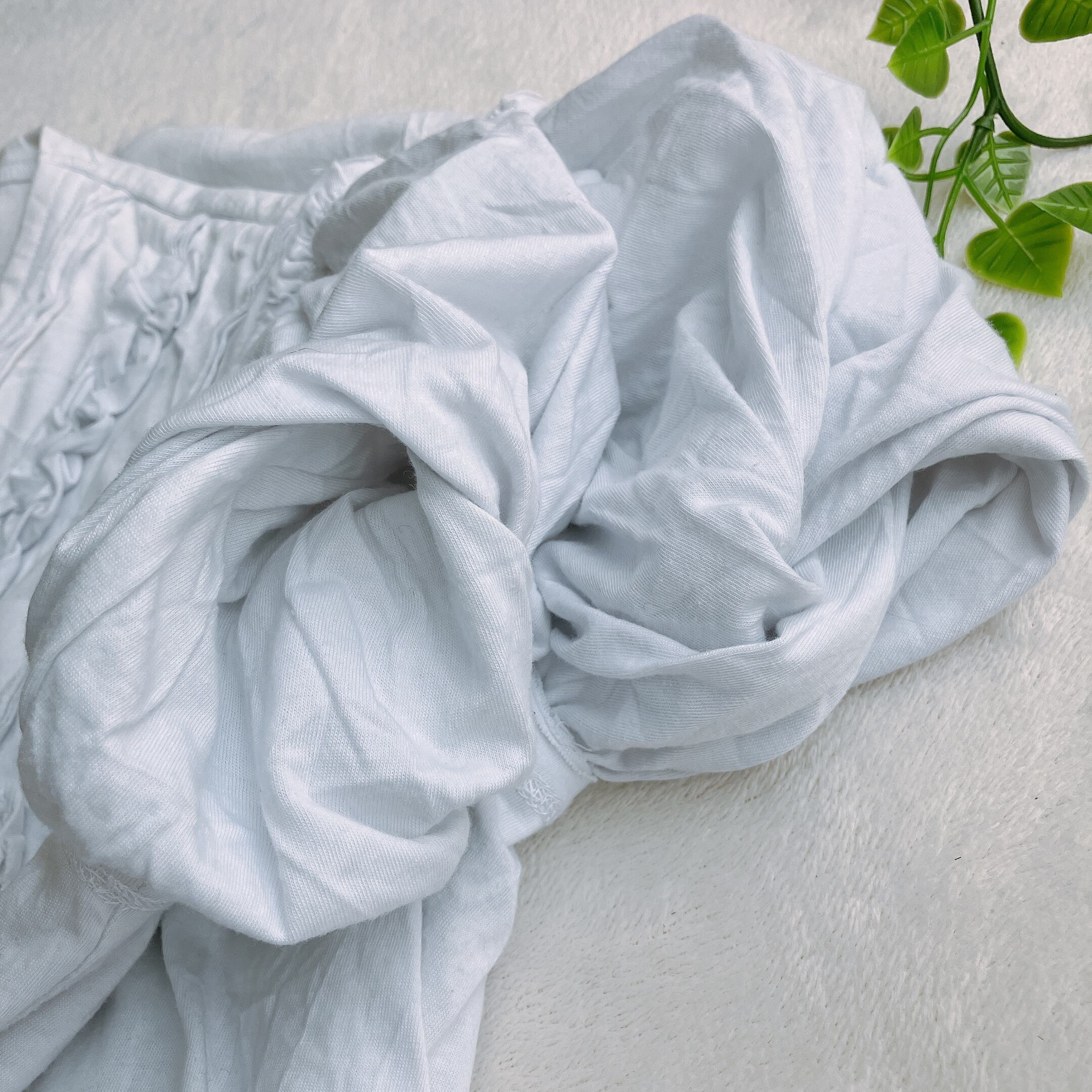 ふんわりとしたパフスリーブ×半袖で女性らしいシルエットを演出。さらに**シワ加工(リンクル加工)**が施されているため、こなれ感があり、アイロン不要で扱いやすいのも魅力。カジュアルからモードまで幅広く活躍します。
