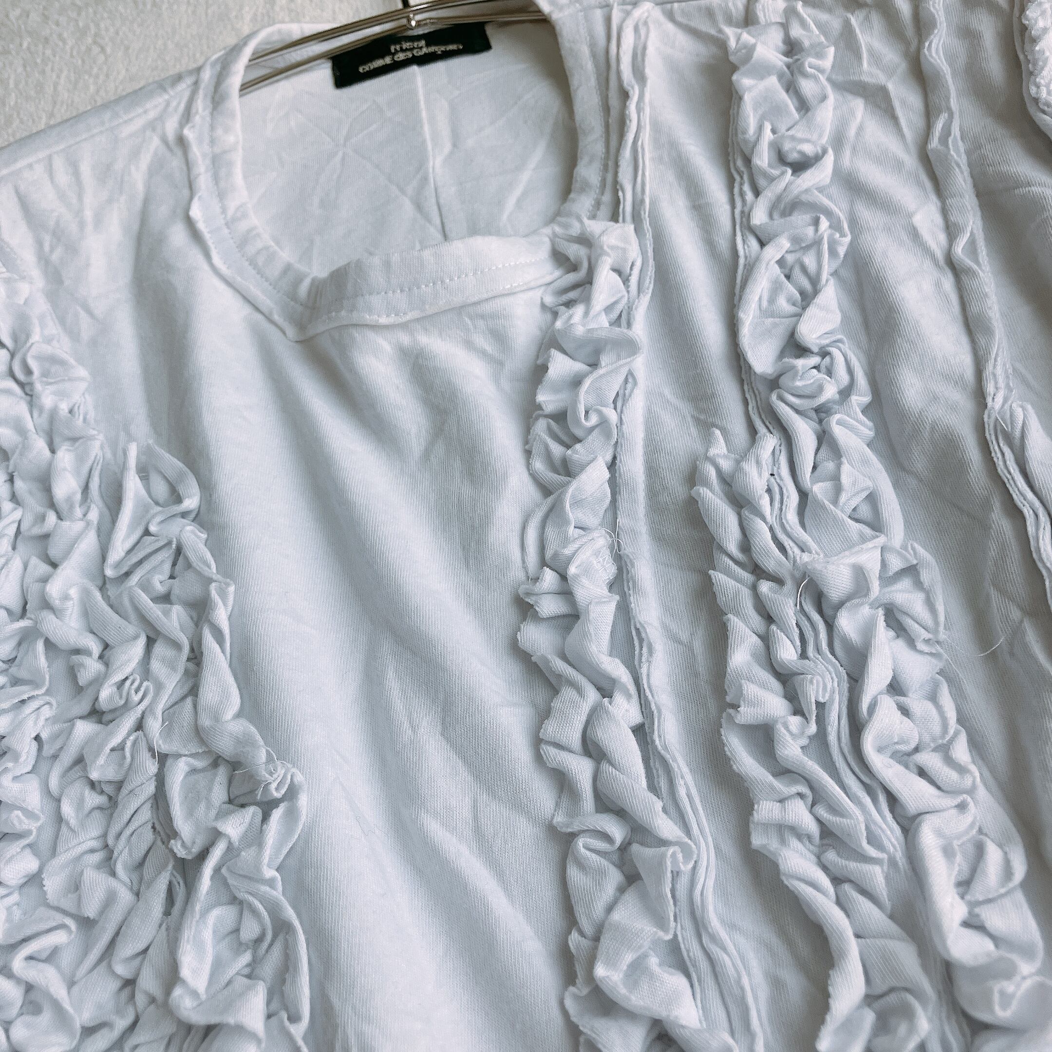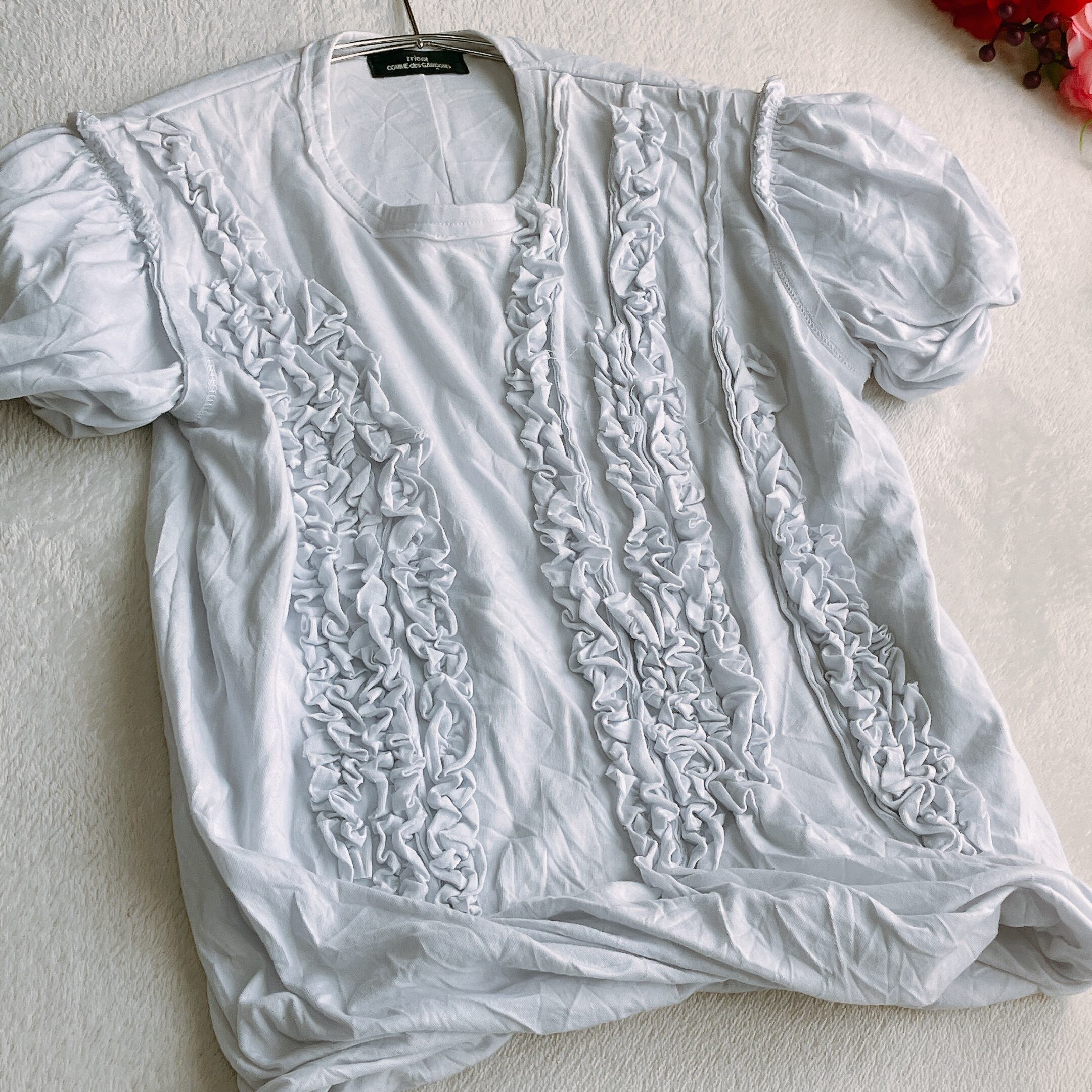 フロントに施された立体的なフリルデザインが目を惹く、COMME des GARONSらしいアーティスティックな一着。シンプルながらも存在感があり、コーデの主役になるデザインブラウス・カットソーです。