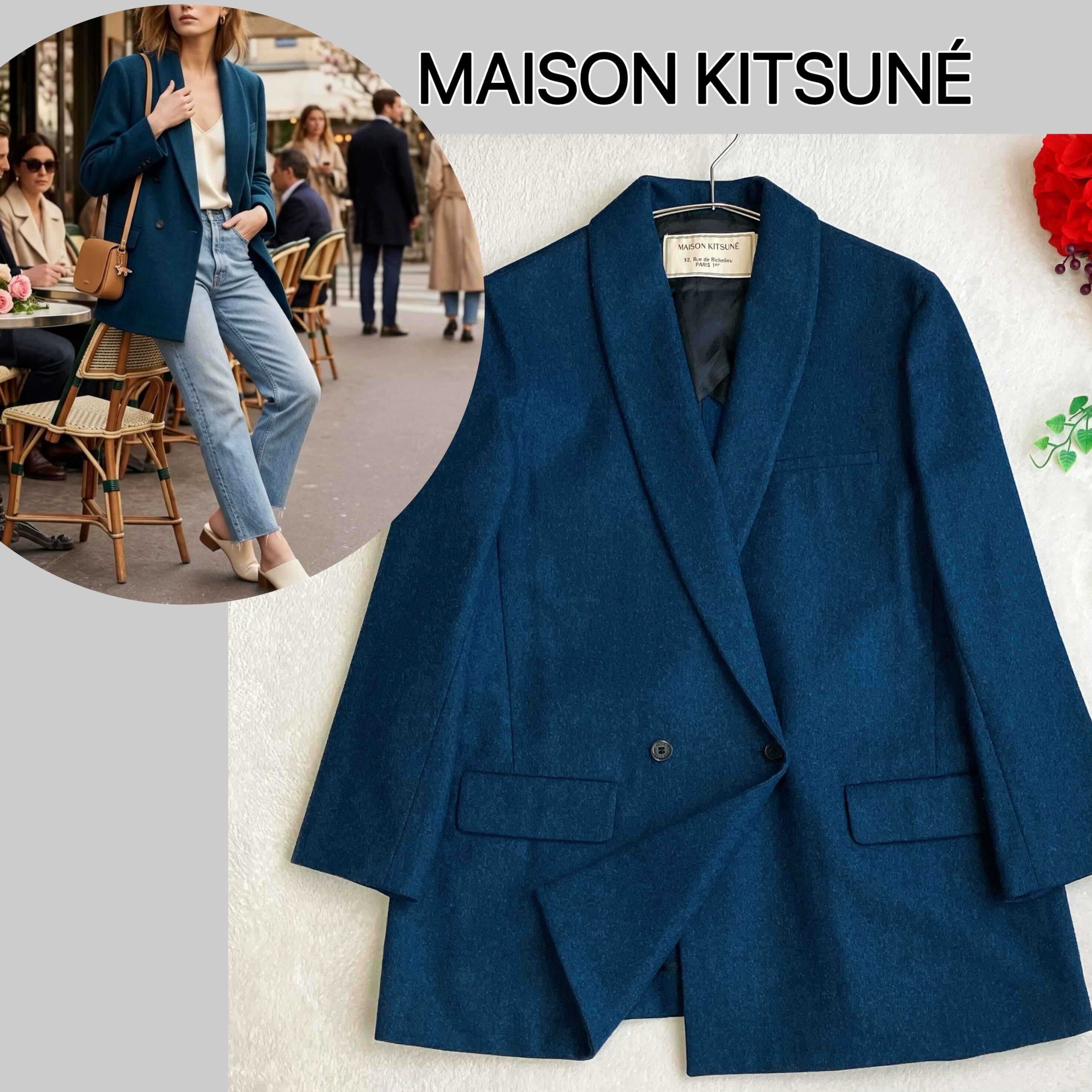 MAISON KITSUNらしい上品でミニマルなデザイン。ショールカラーとダブルボタンがクラシカルかつ都会的な印象を演出し、きれいめコーデ・オフィスカジュアル・通勤スタイルにも最適なテーラードジャケットです。