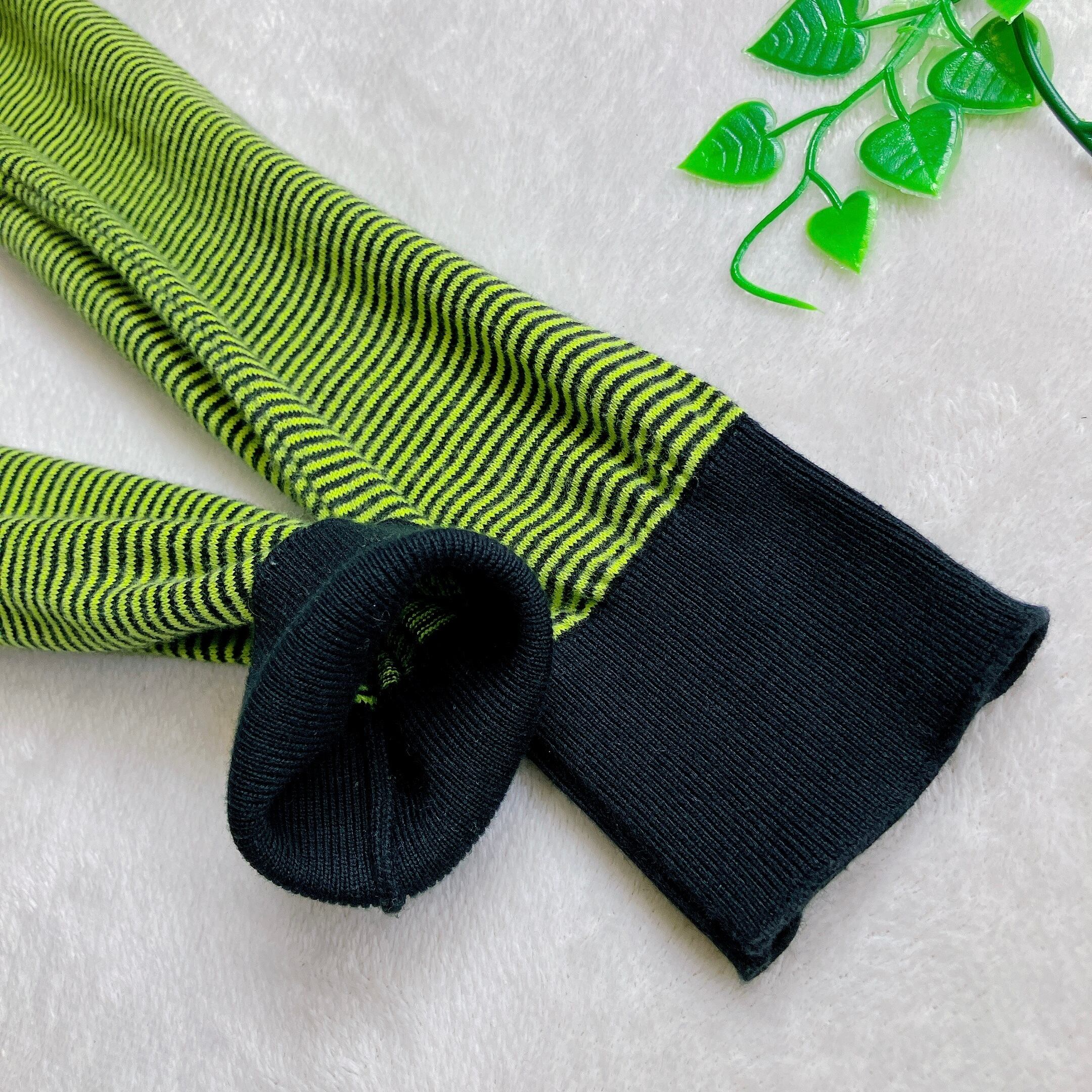 ブラック×ライムグリーンのバイカラー切替えと細ボーダーが特徴的で、「バイカラーカーディガン」「ボーダーニット」「大人カジュアルコーデ」にぴったり。シンプルながらもコーデの主役になるデザイン性が魅力です。