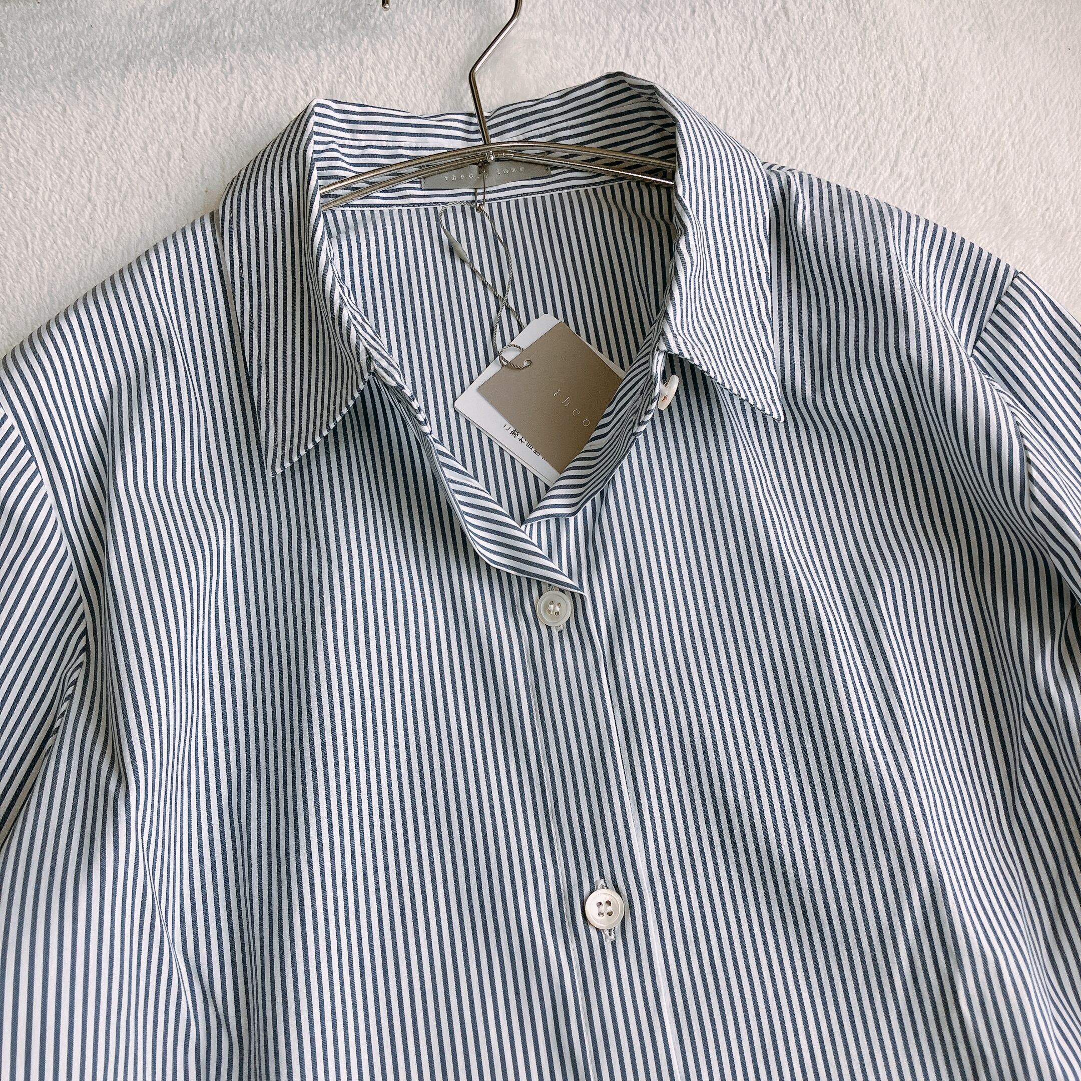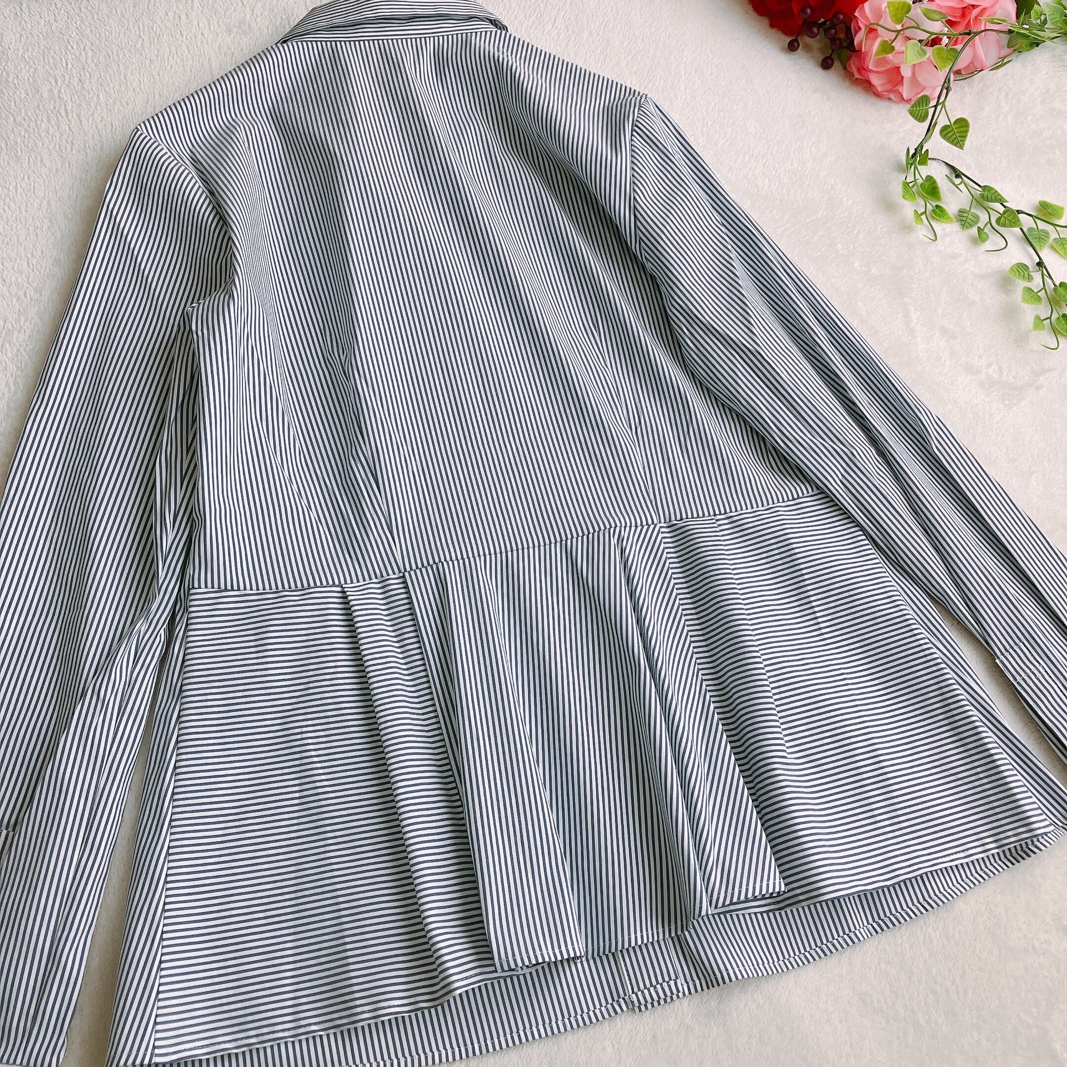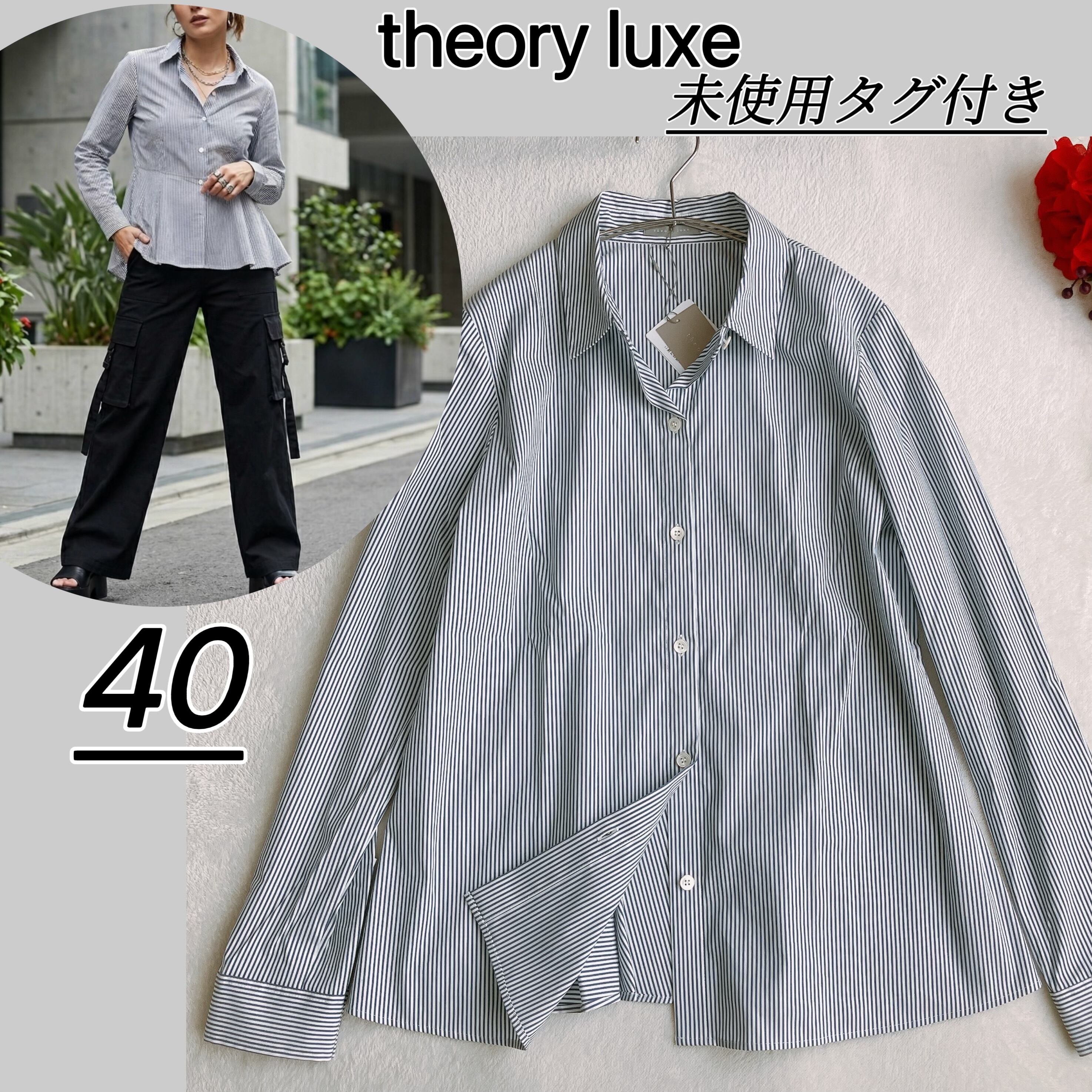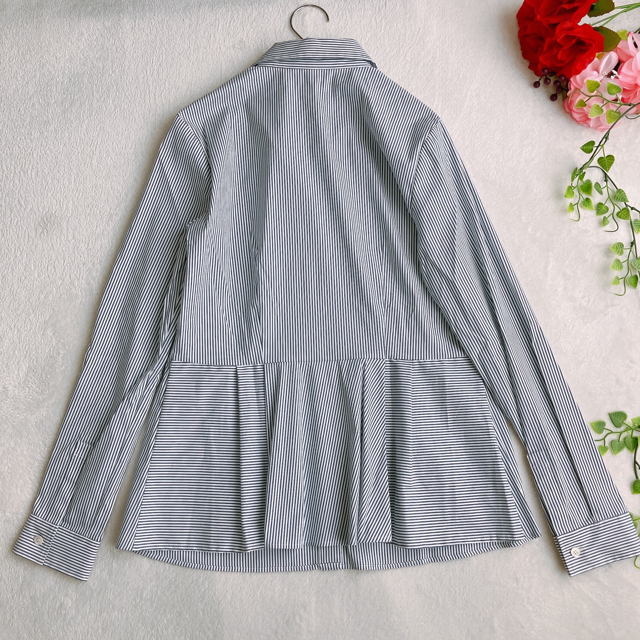 【未使用タグ付き】theory luxe セオリーリュクス★ペプラム ストレッチ ストライプシャツ JADE 長袖 ネイビー系×ホワイト