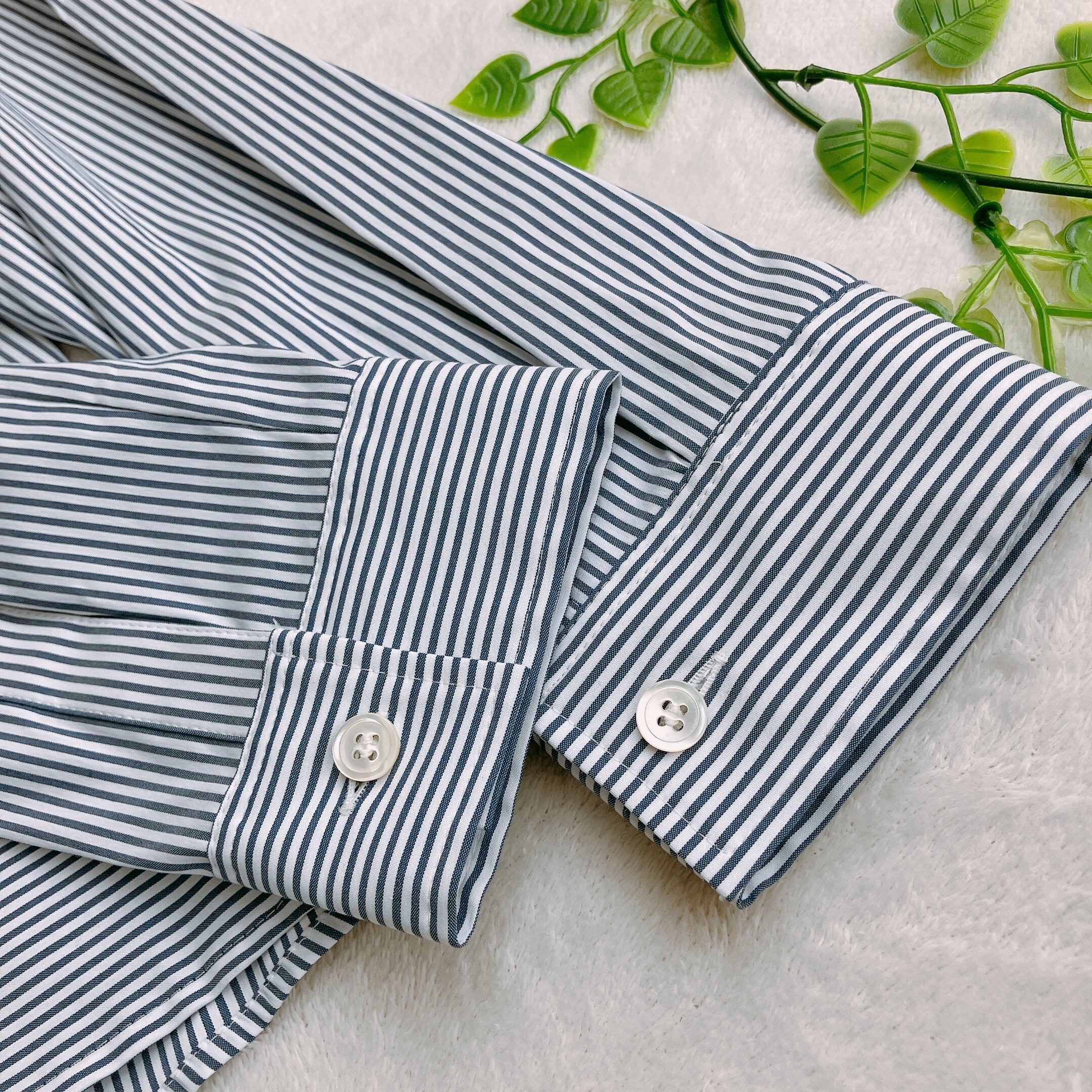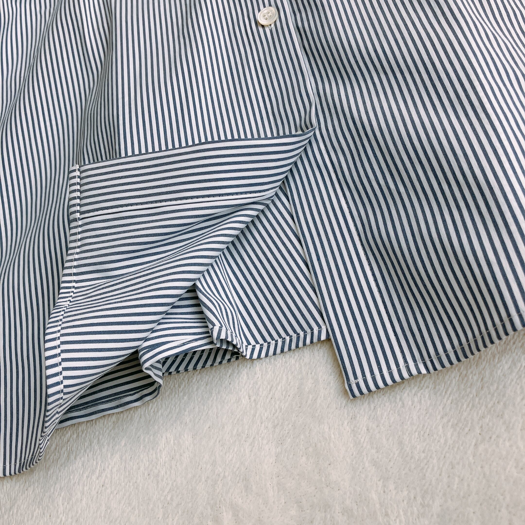 ネイビー×ホワイトのストライプ柄が爽やかで知的な印象に。「ストライプシャツ」「細見え」「大人カジュアル」「きれいめトップス」などをお探しの方におすすめです。