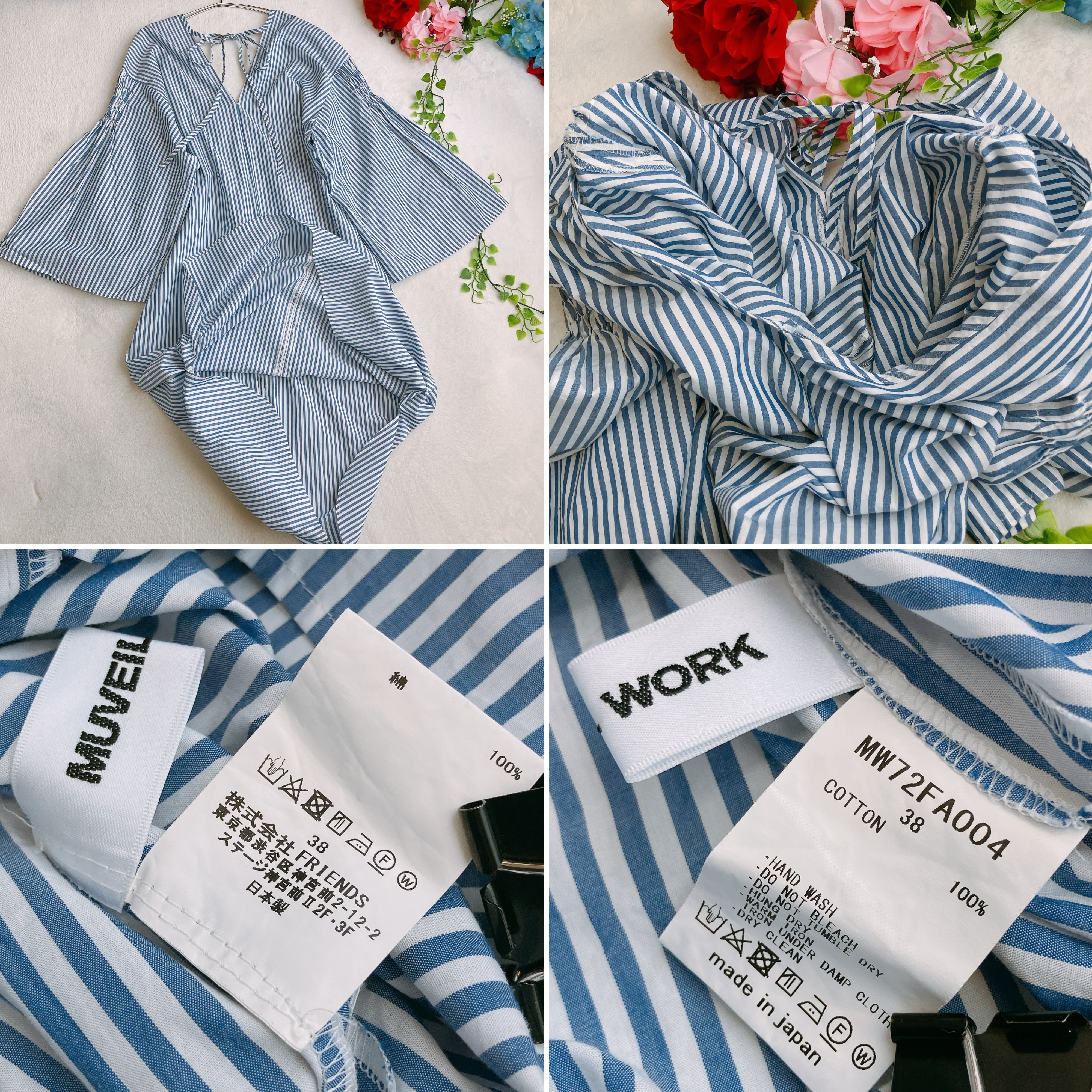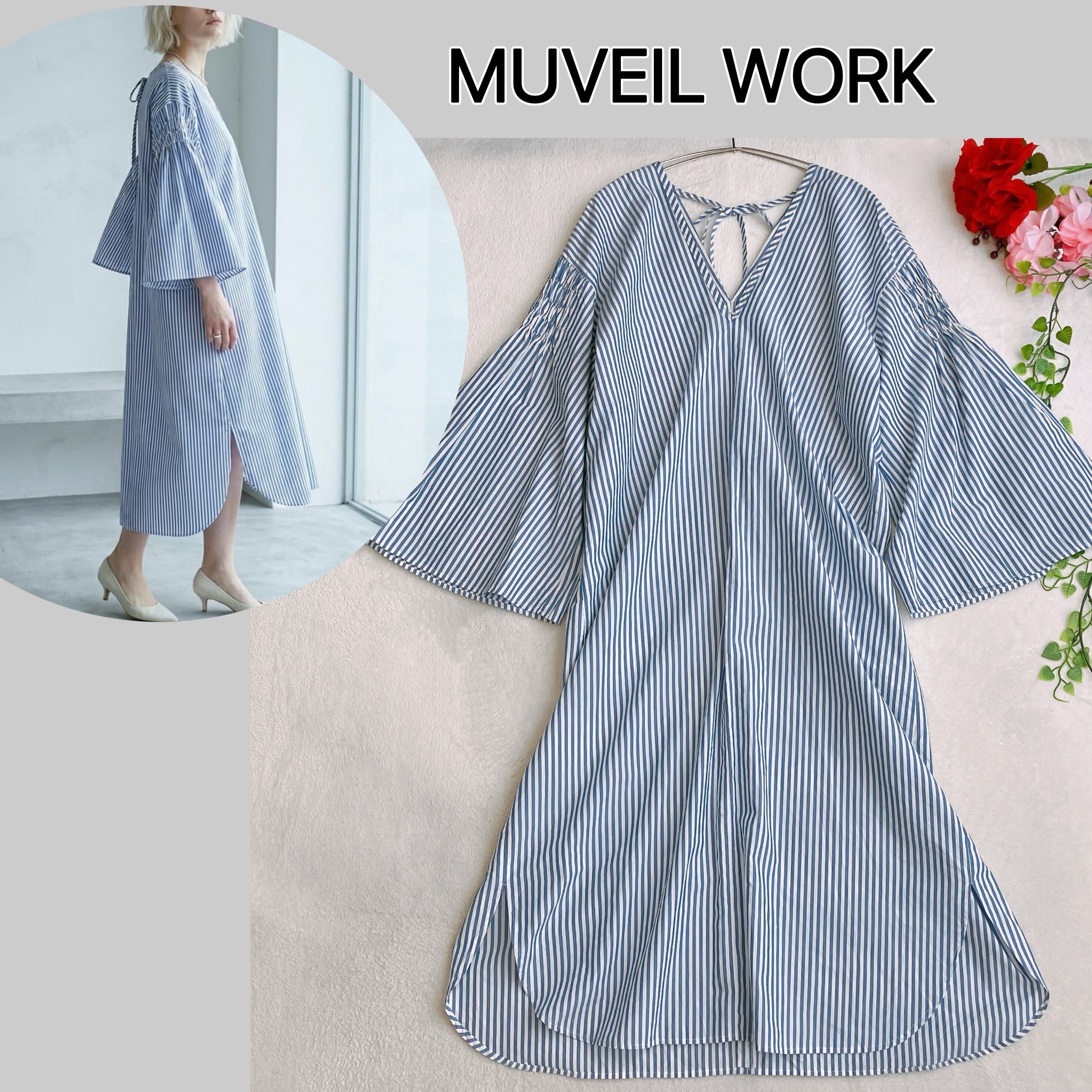【美品】【手洗い可】MUVEIL WORK ミュベールワーク★ビッグシルエット フレアスリーブ ワンピース ストライプ ドロップショルダー