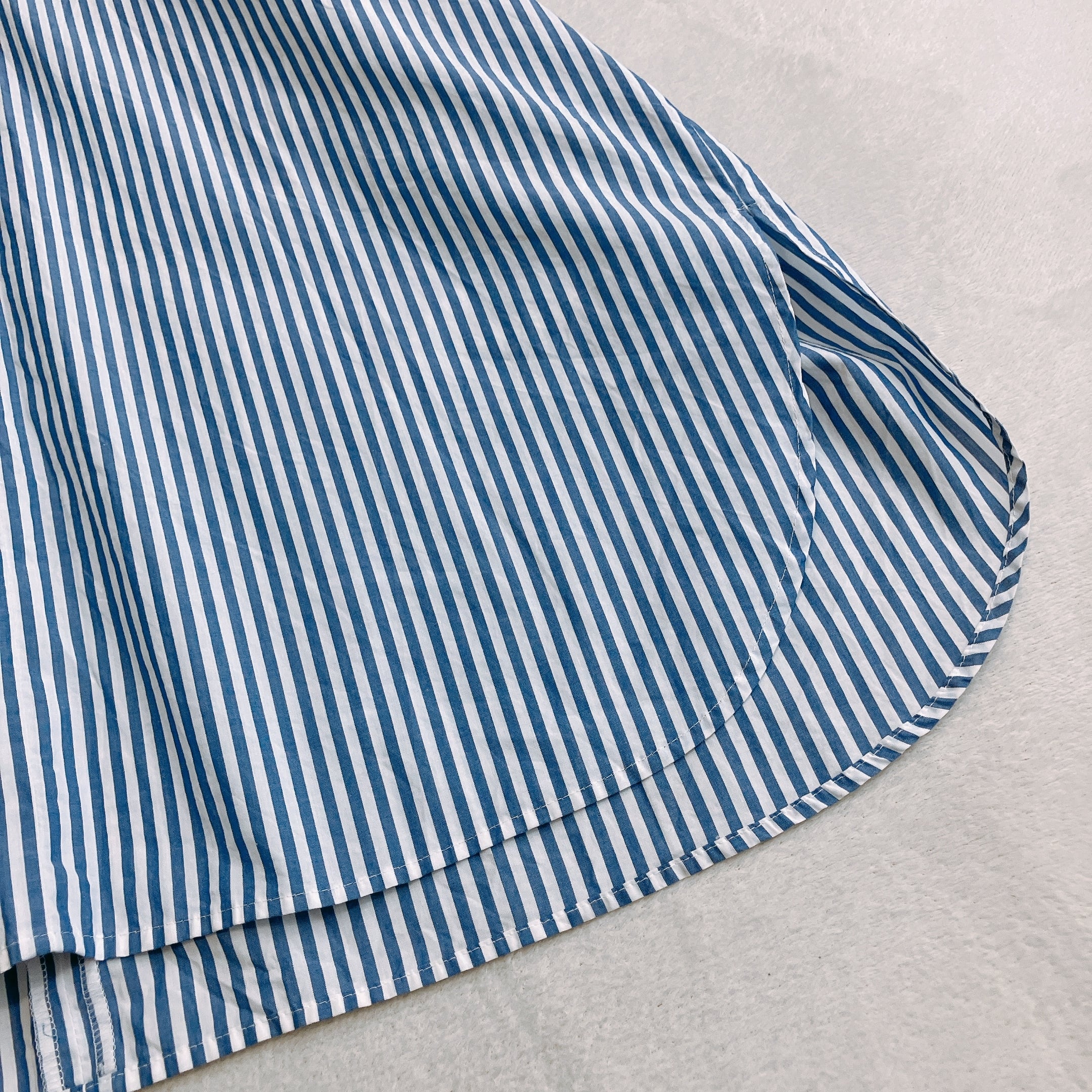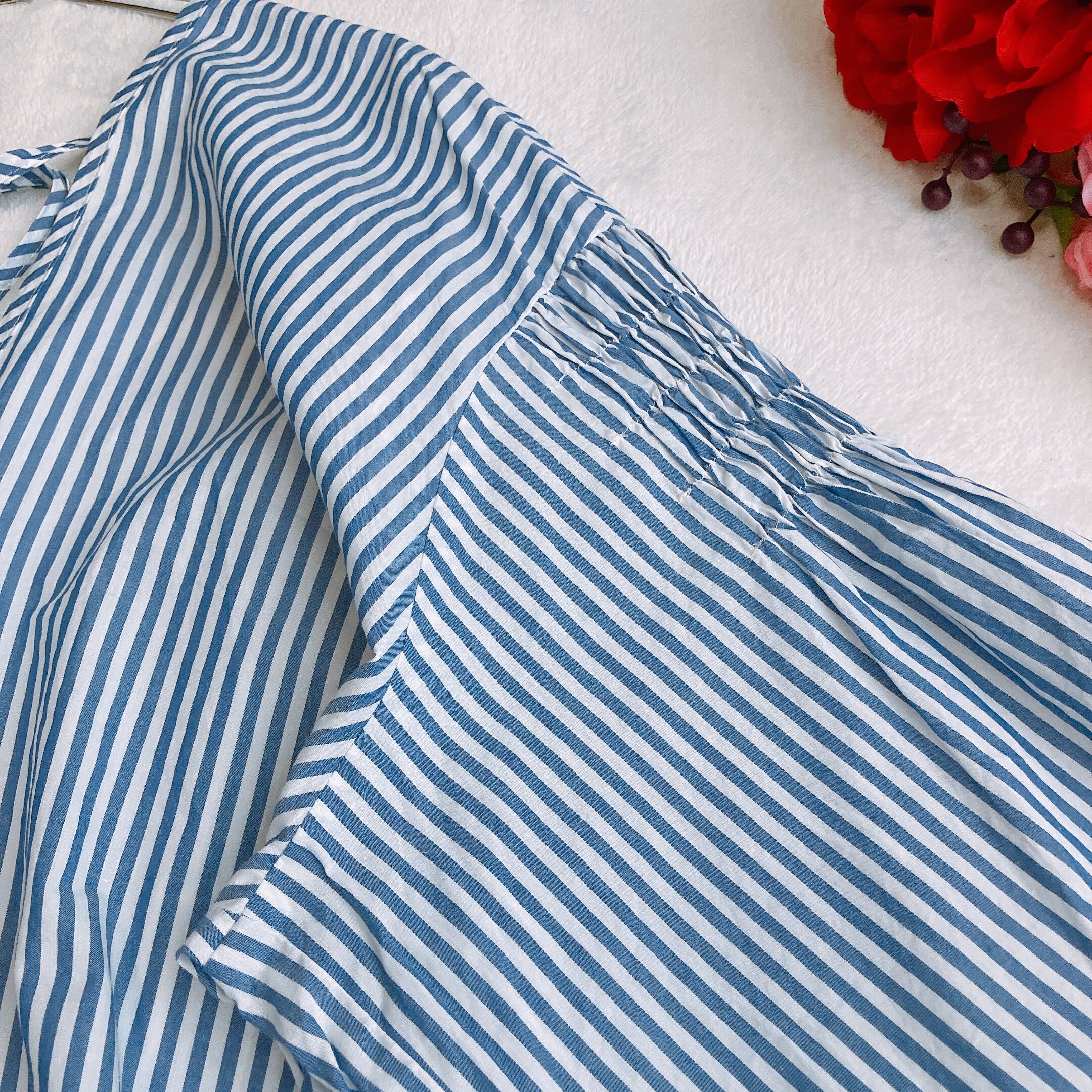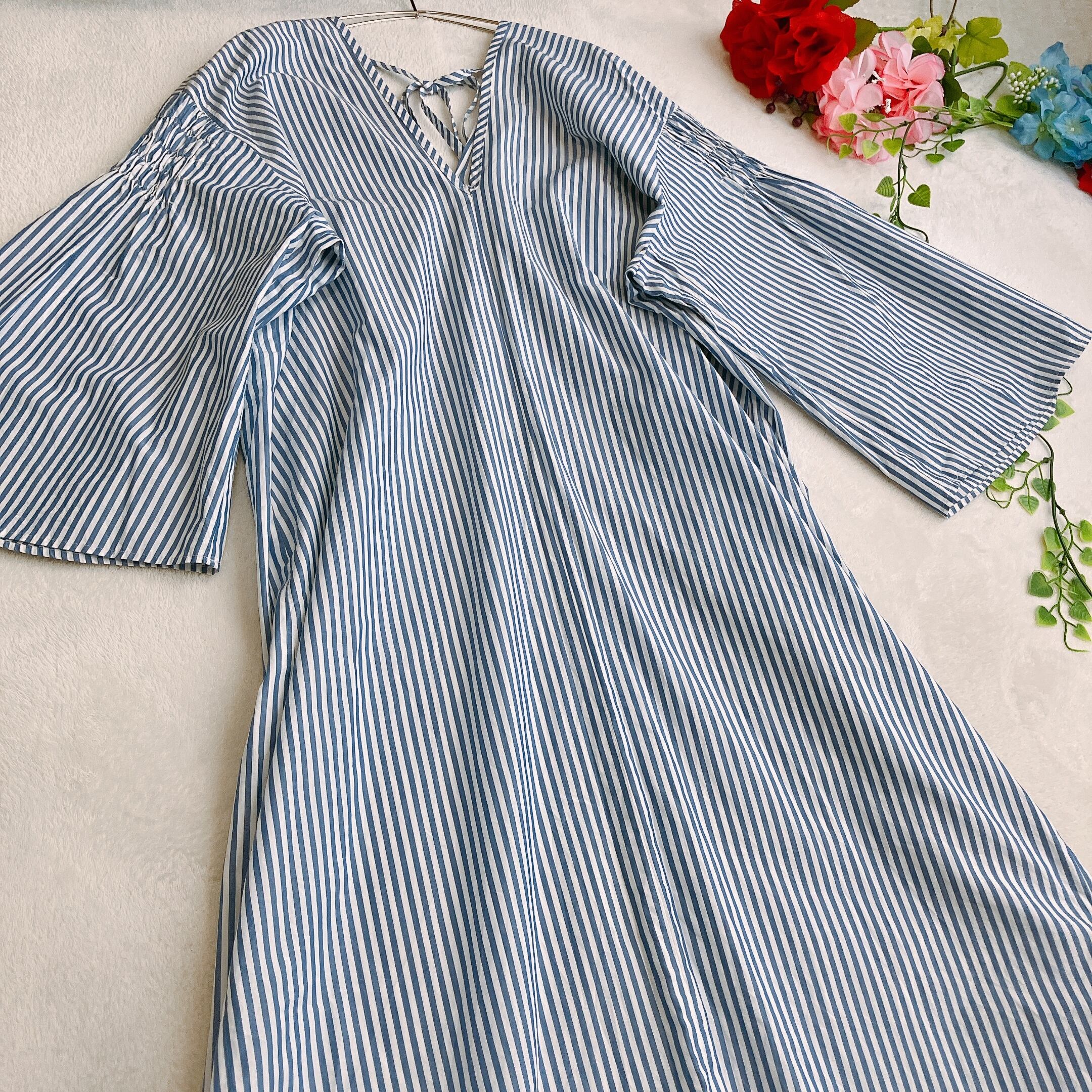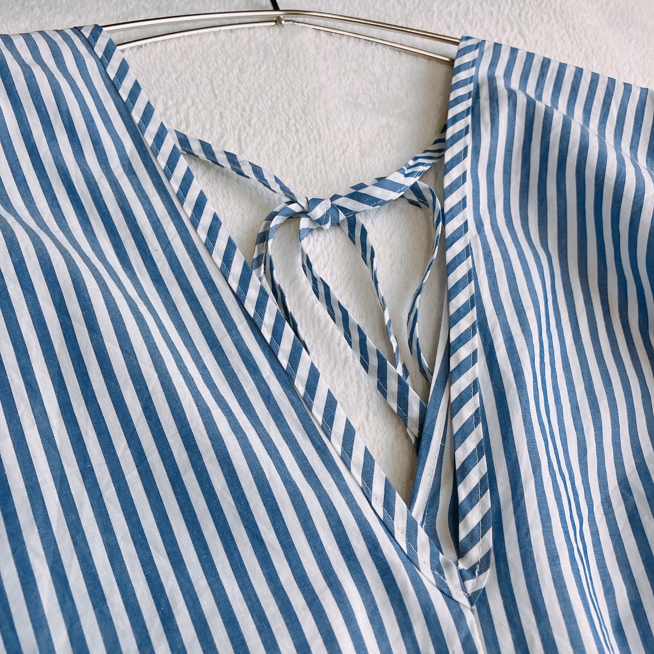 フレアスリーブ×Vネックの女性らしいディテールが魅力。リボンデザインがさりげないアクセントになり、ブルー×ホワイトの爽やかなストライプ柄で春夏コーデにぴったりの一枚です。