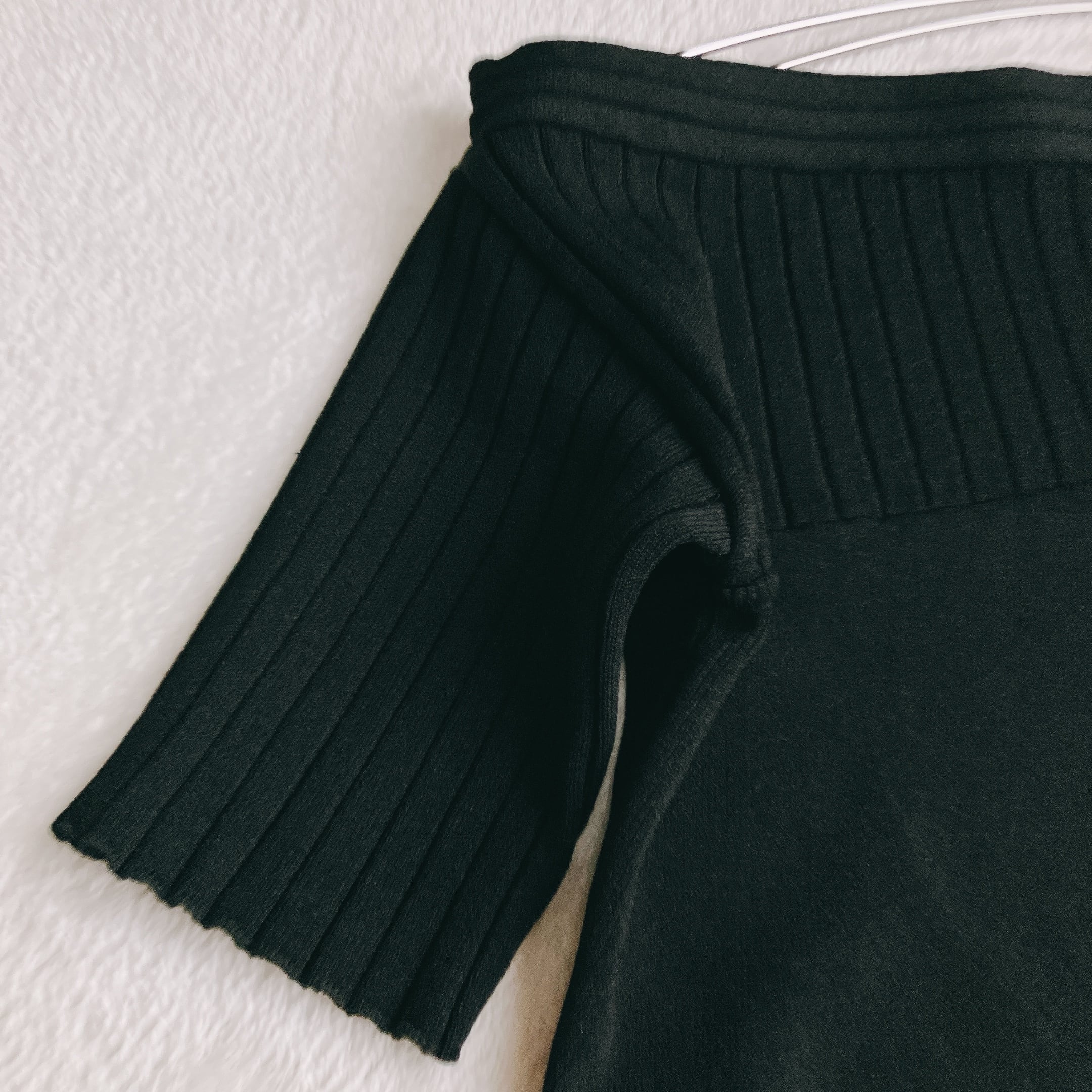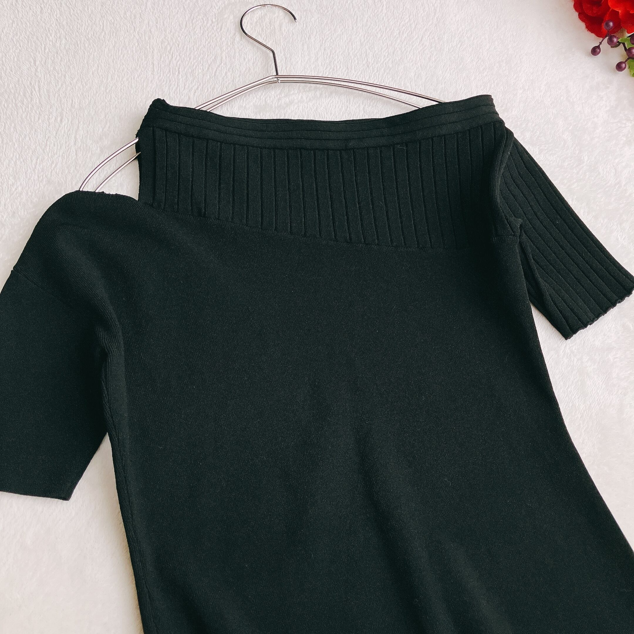 ② 女性らしさを引き立てるオフショル×リブ切替