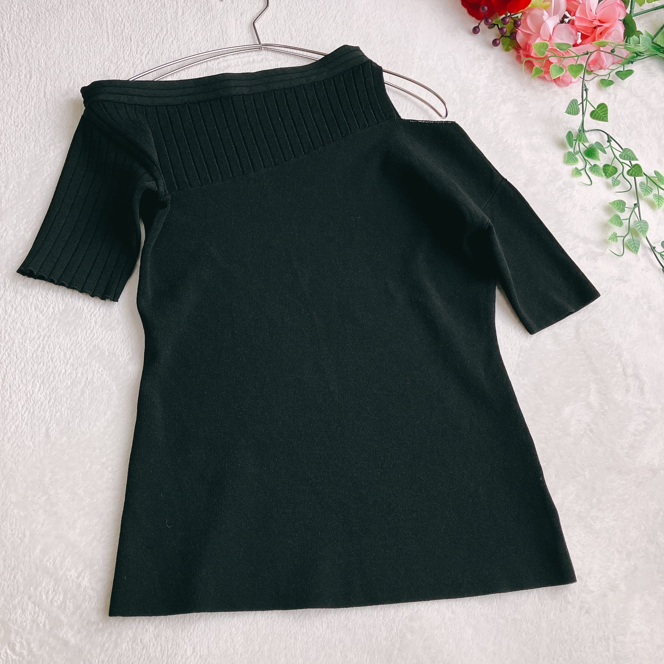 【美品】アンスリード UN3D.★アシンメトリー オフショル ニットトップス リブ切替え 半袖 レーヨン ブラック
