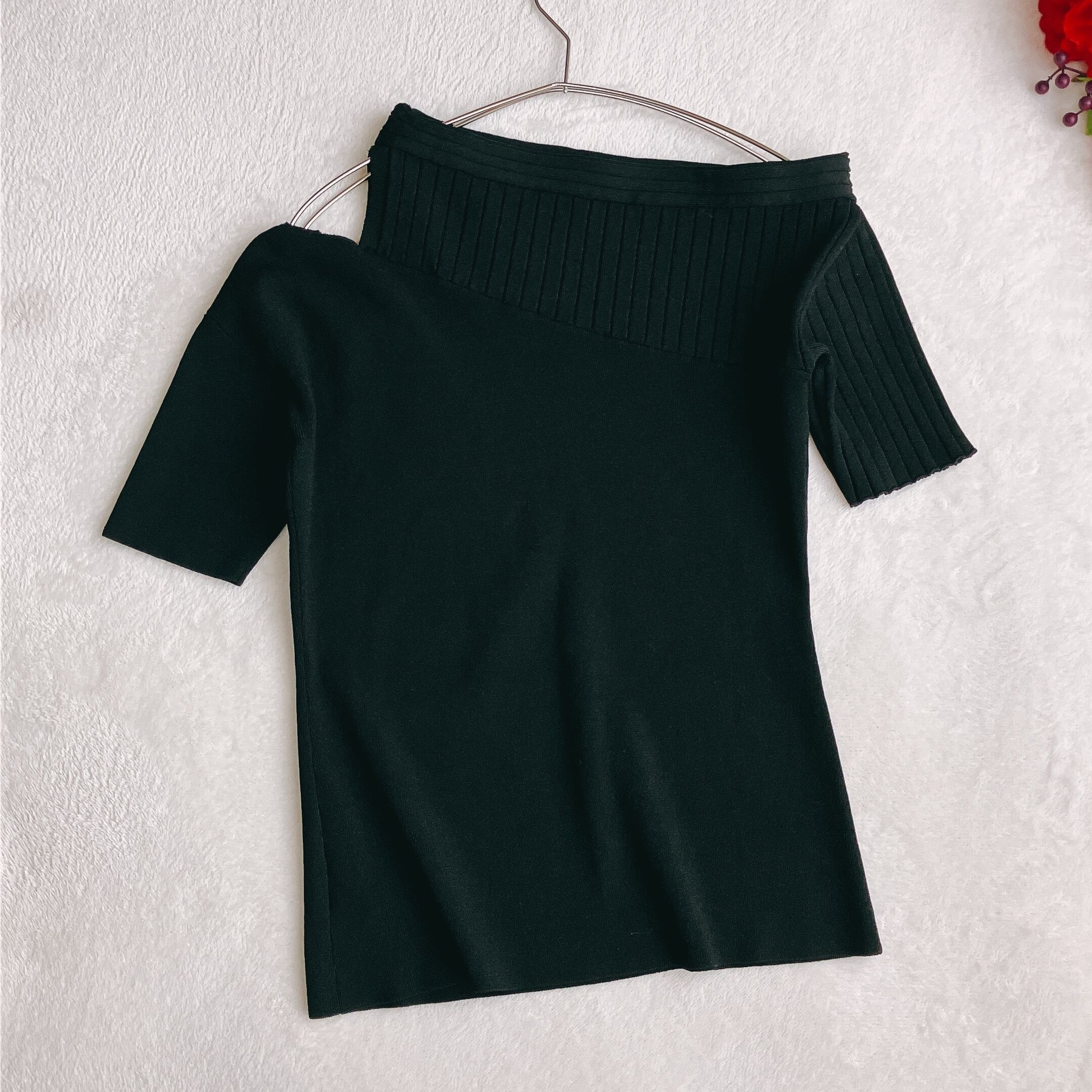 ベーシックなブラックカラーで、デニム・ワイドパンツ・スカートなど幅広いコーデに対応。春夏秋とロングシーズン使える「オフショルニット」「アシメトップス」「モード系トップス」をお探しの方におすすめです。