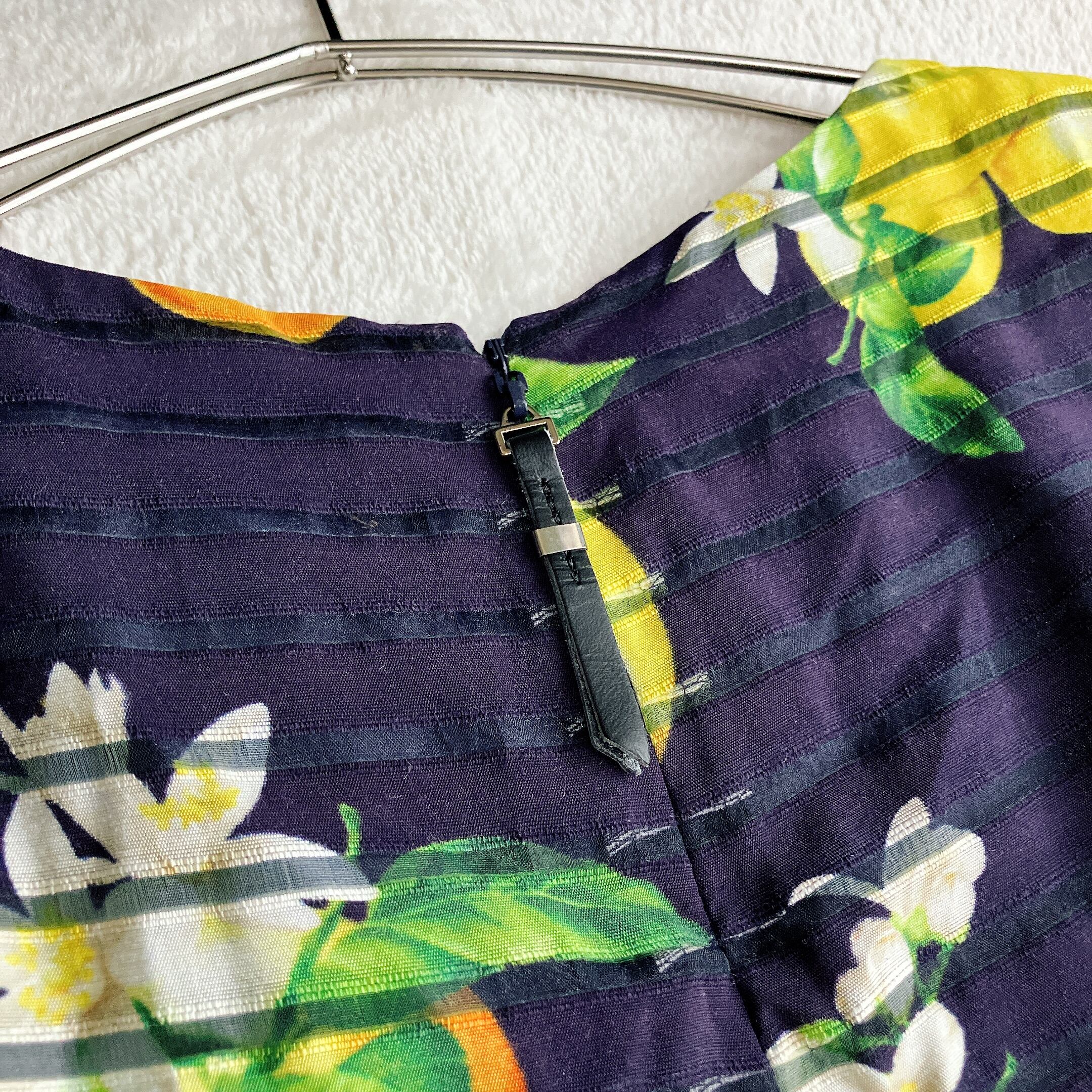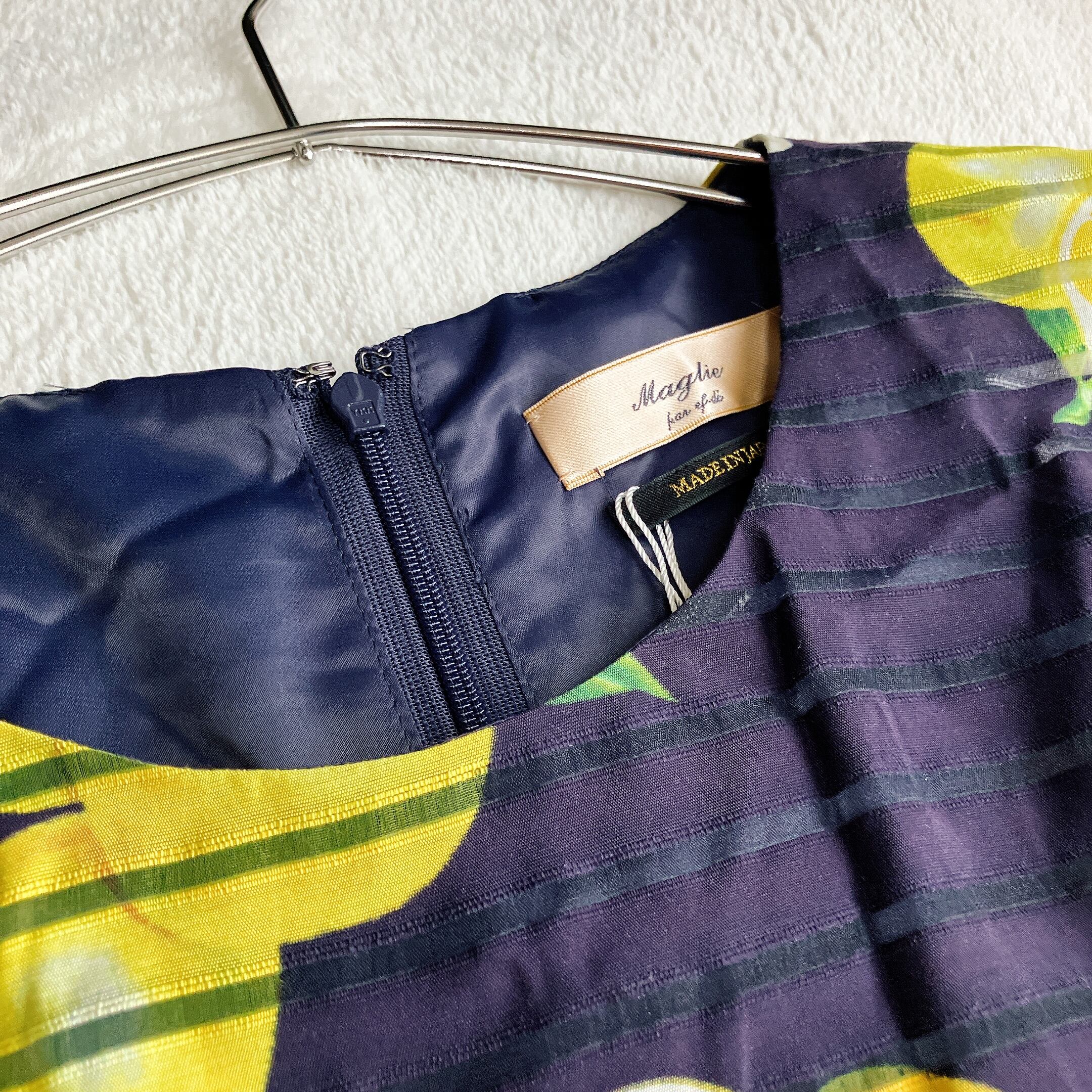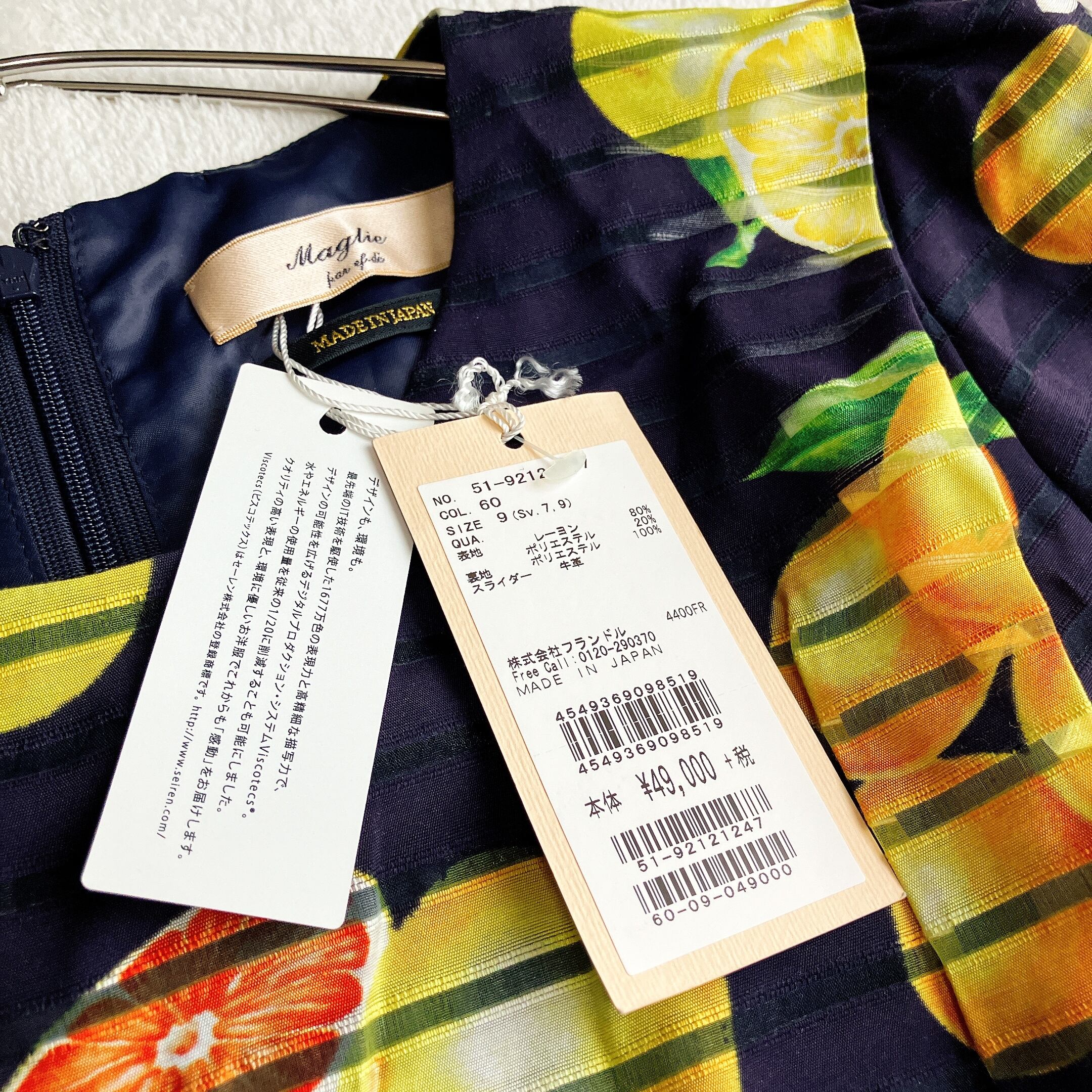 Maglie par ef-de(マーリエパーエフデ)らしい上品さに、レモンなどのフルーツ柄が映える華やかなワンピース。ダークネイビーをベースにした落ち着きのある配色で、大人可愛い・夏コーデ・リゾートスタイルにもぴったりの一着です。