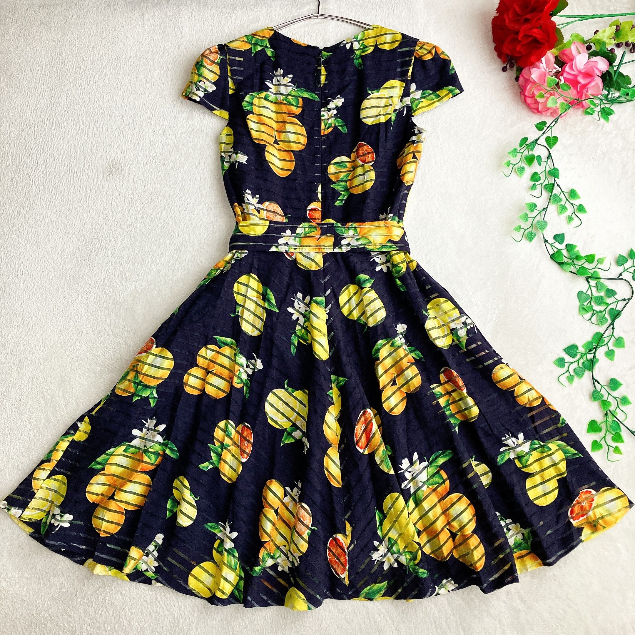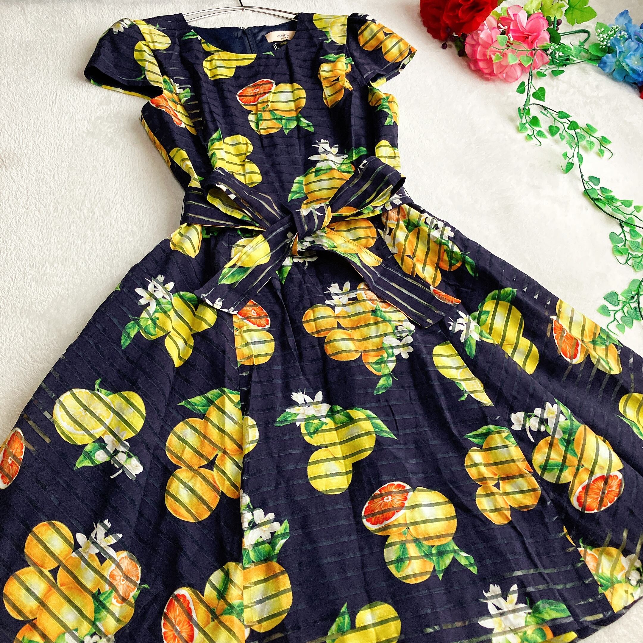 Maglie par ef-de マーリエパーエフデ★フルーツ柄 ワンピース フレア ウエストリボン Aライン シアサッカー パフスリーブ ダークネイビー×イエロー×マルチ