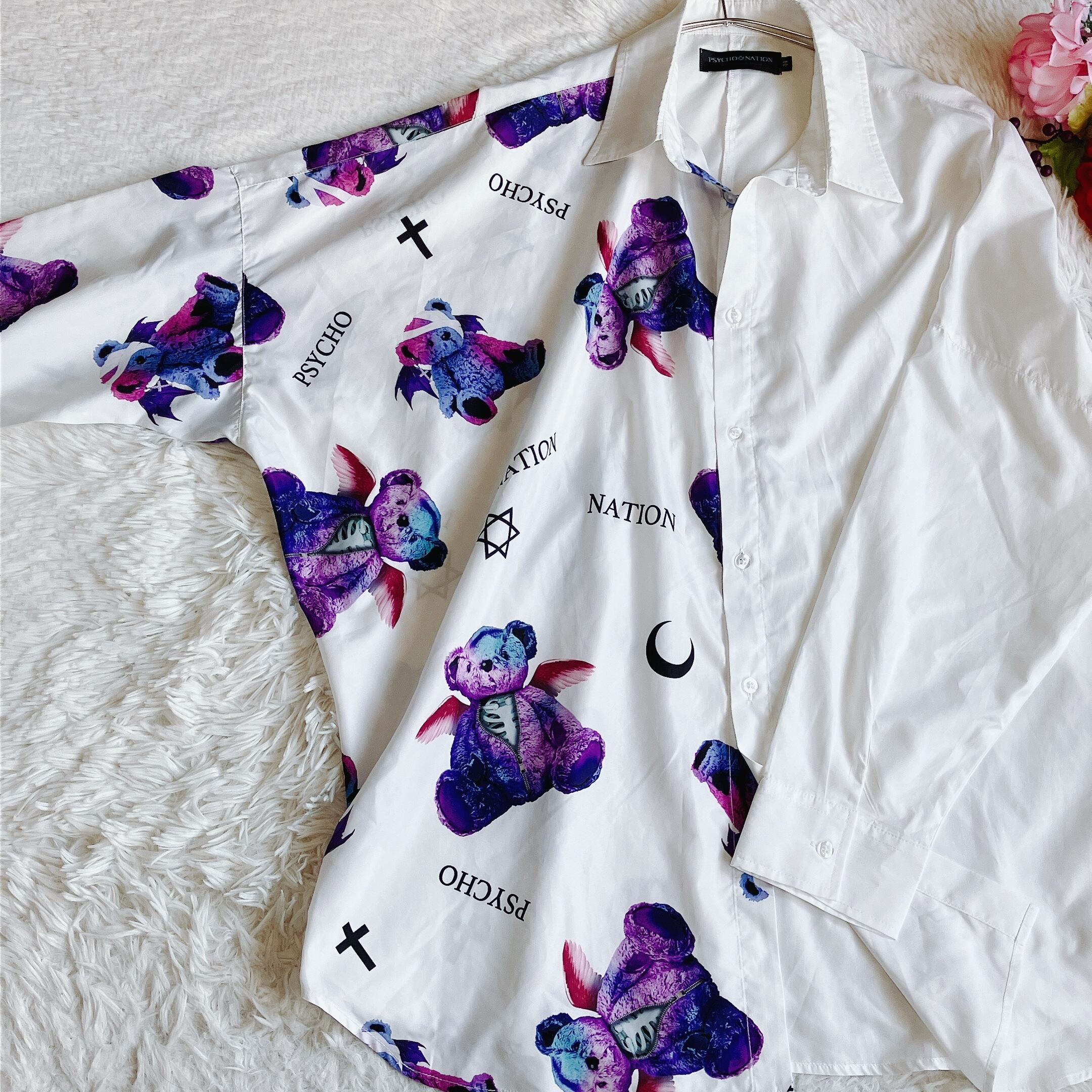 PSYCHO NATION サイコネーション★オーバーサイズシャツ 長袖 包帯ベア サイコベア ジェンダーレス ホワイト【リユース美品】【大きいサイズ】
