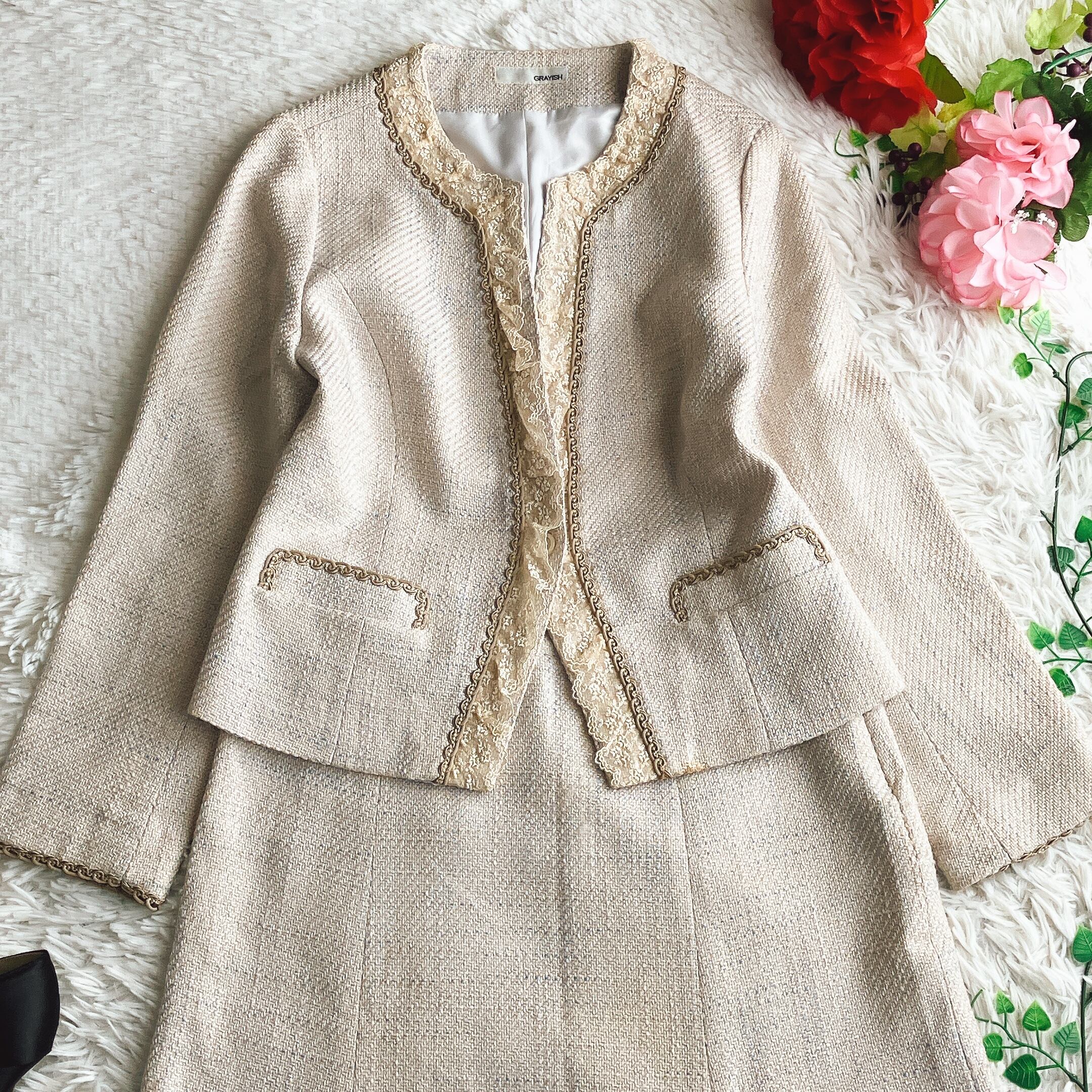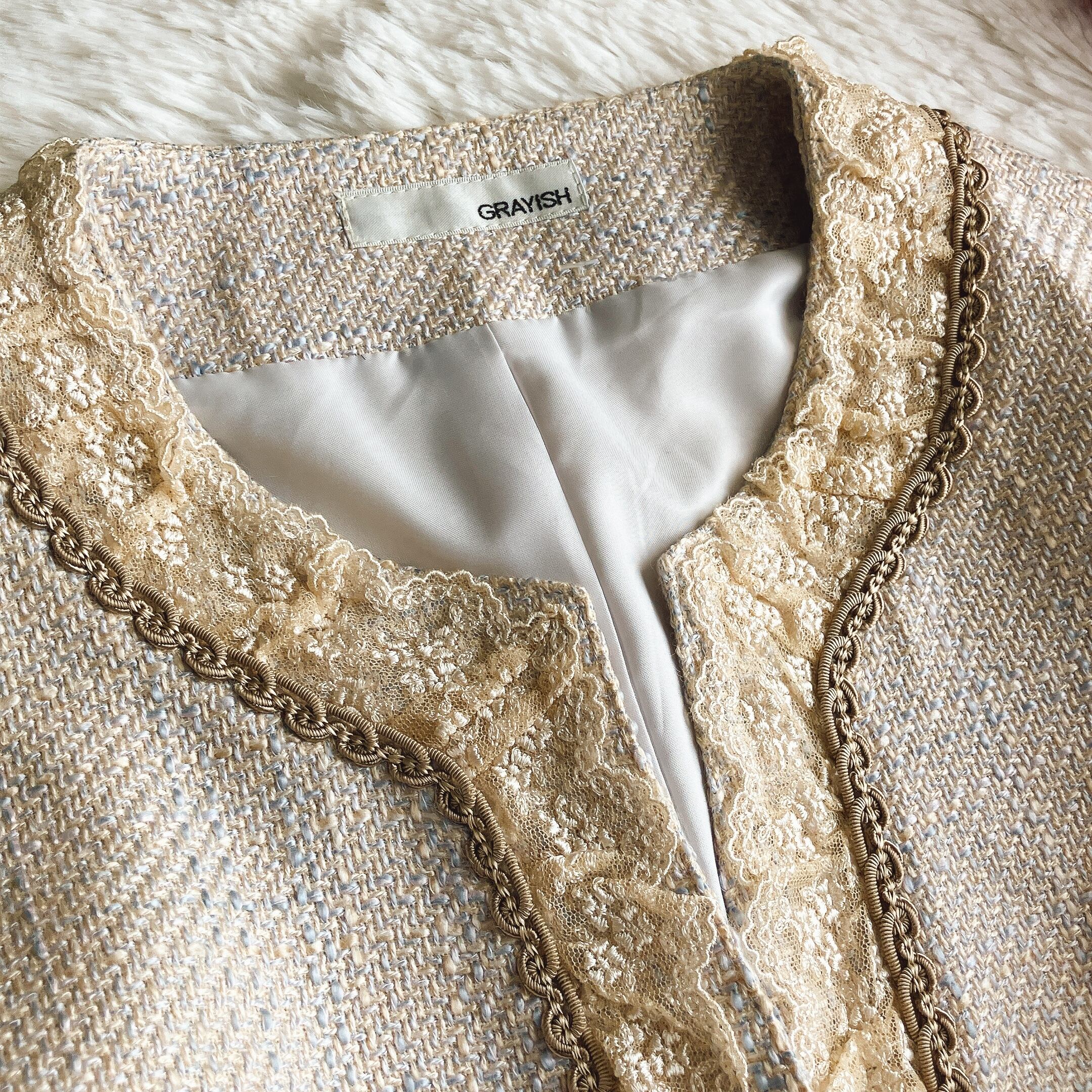 GRAYISH グレイッシュ パルチザン★ツイード ノーカラー Aライン スカートスーツ Vネック レース フレアスカート セレモニースーツ ベージュ