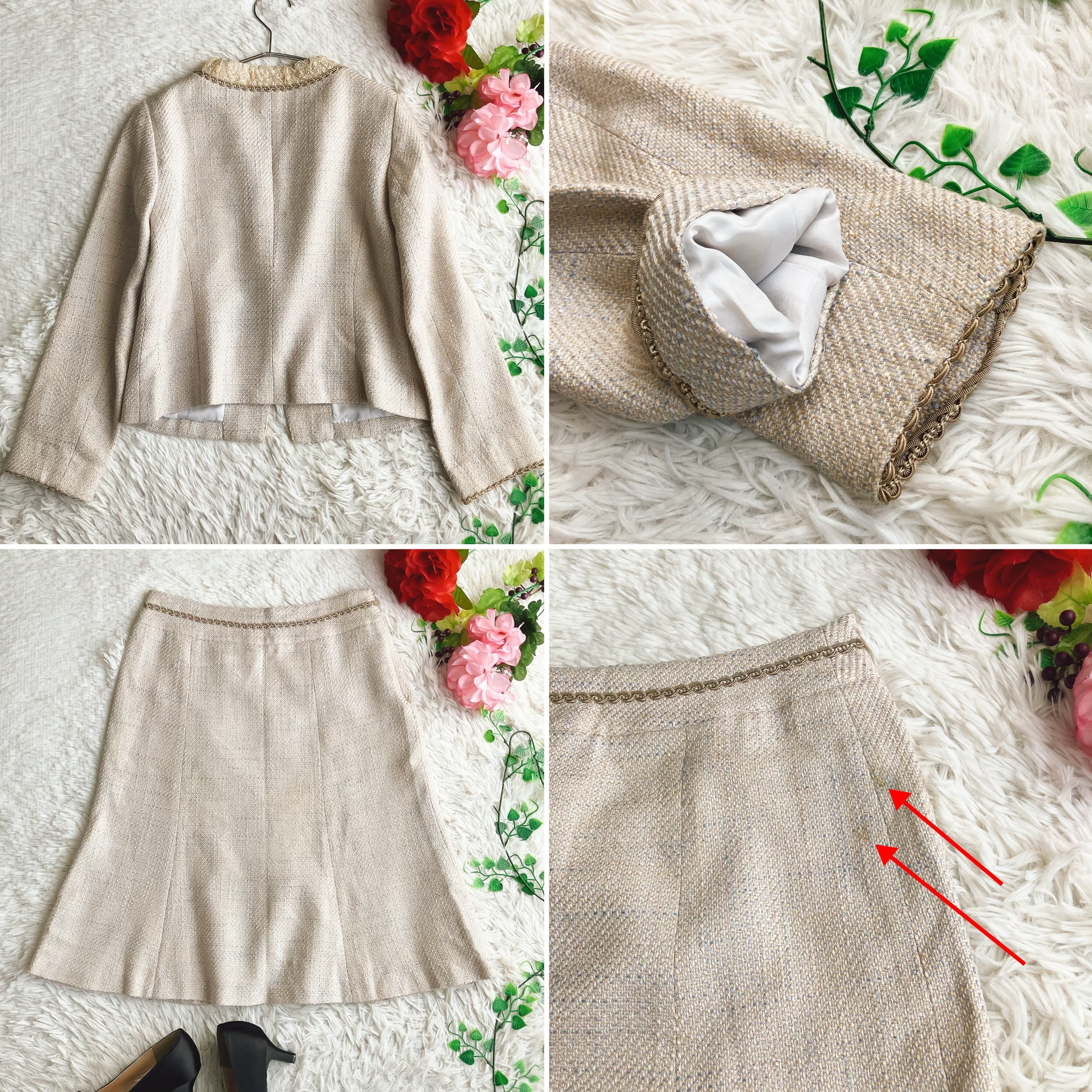 グレイッシュ パルチザン★ツイード ノーカラー Aライン スカートスーツ Vネック レース フレアスカート【卒園式 卒業式 入学式/日本製】【リユース品】